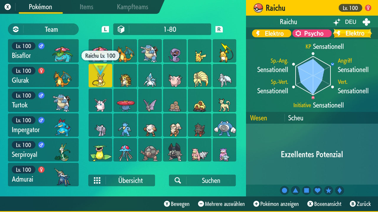 Das Pokemon ist mit beeindruckenden 6×31 IV-Werten ausgestattet. Das bedeutet, dass es auf allen sechs Werten (KP, Ang., Sp-Ang., Vert., Sp-Vert., Init.) die maximalen 31 IV/DV-Punkte besitzt. Dein Pokemon startet somit mit herausragender Stärke in digitale Kämpfe.