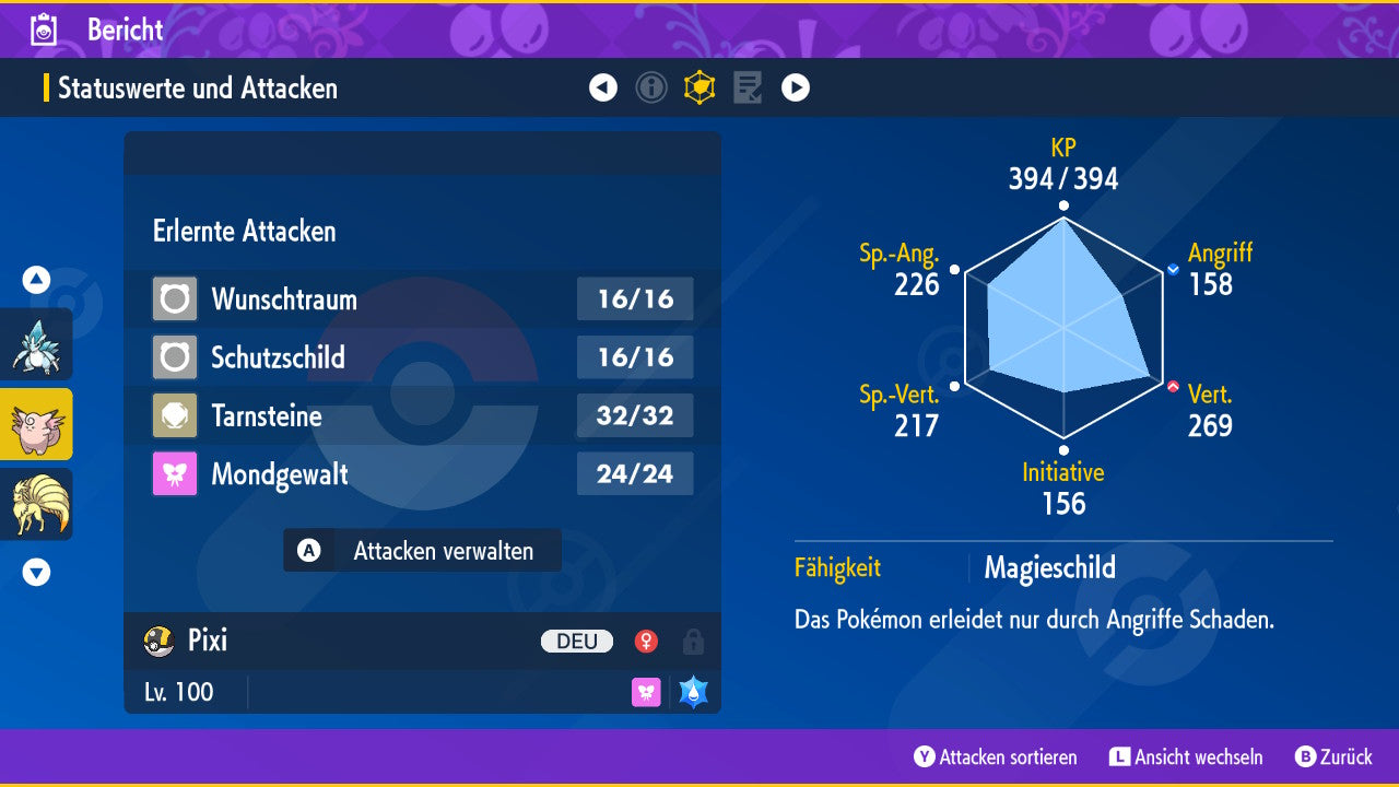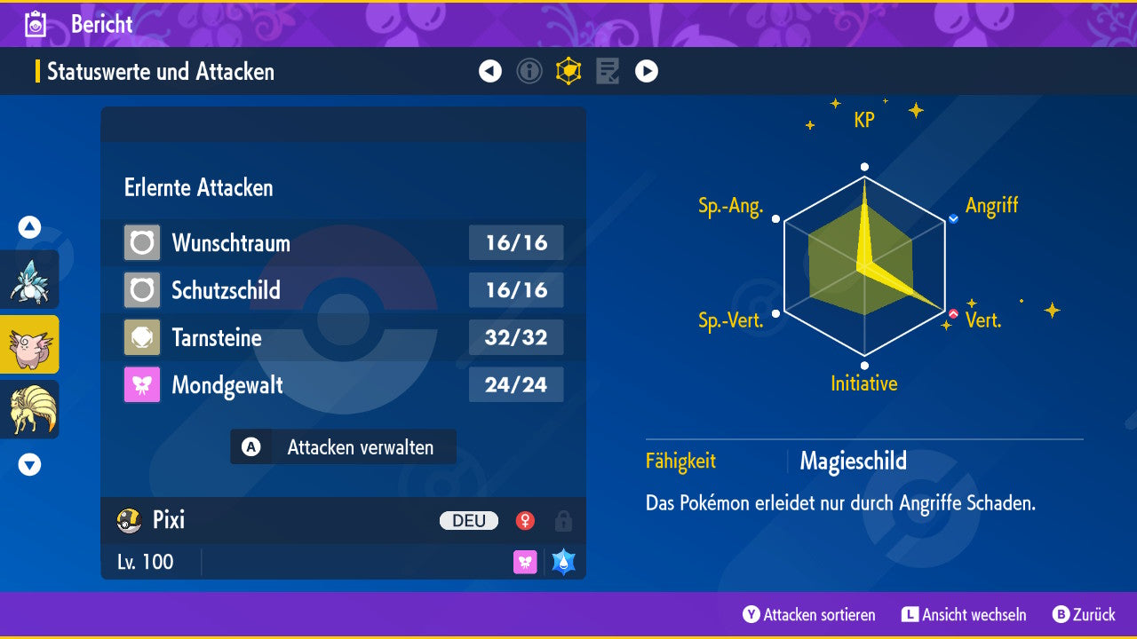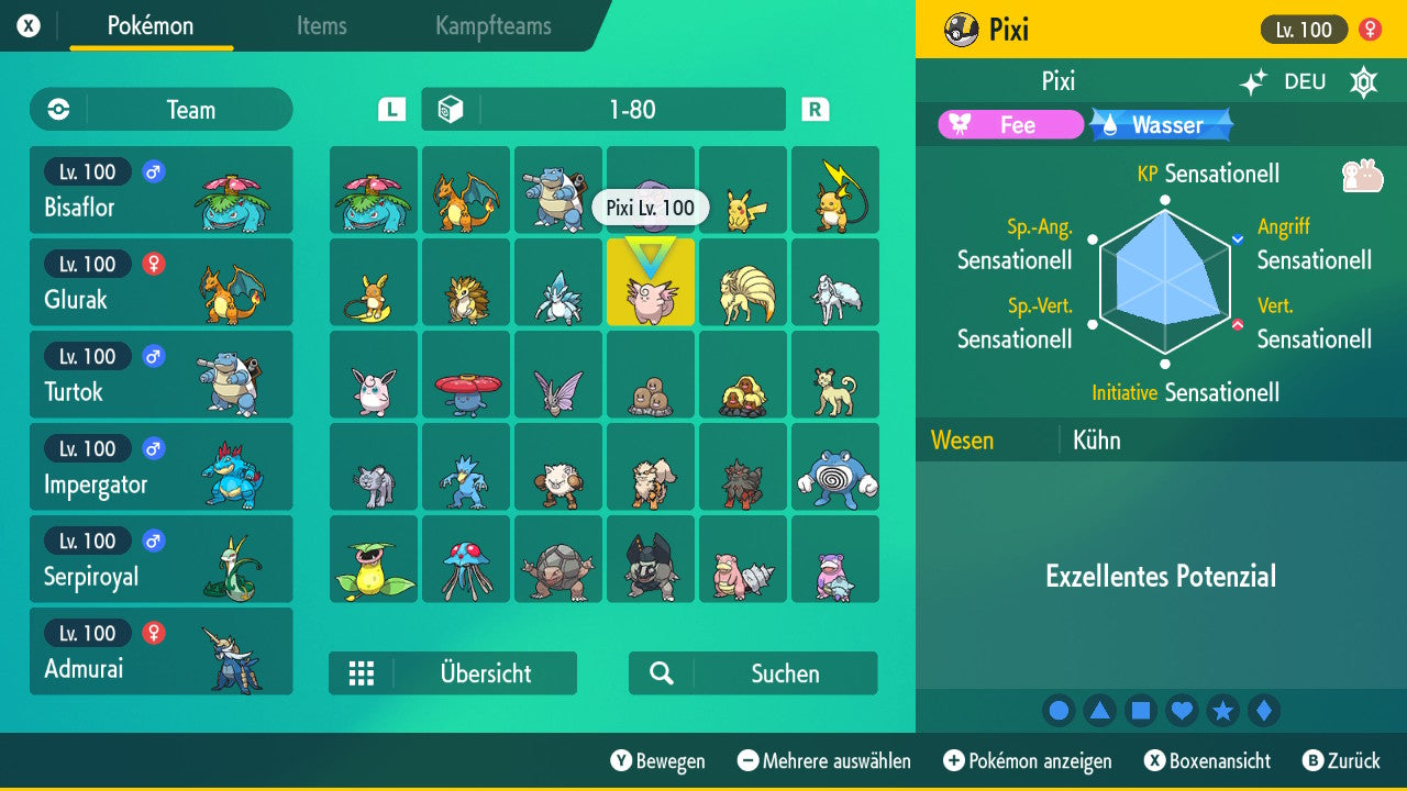 Das Pokemon ist mit beeindruckenden 6×31 IV-Werten ausgestattet. Das bedeutet, dass es auf allen sechs Werten (KP, Ang., Sp-Ang., Vert., Sp-Vert., Init.) die maximalen 31 IV/DV-Punkte besitzt. Dein Pokemon startet somit mit herausragender Stärke in digitale Kämpfe.