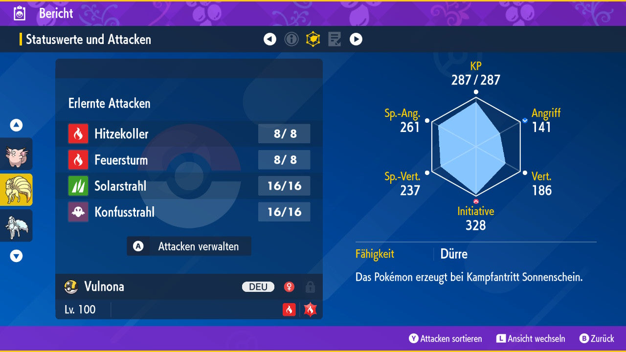 Das Pokemon ist mit beeindruckenden 6×31 IV-Werten ausgestattet. Das bedeutet, dass es auf allen sechs Werten (KP, Ang., Sp-Ang., Vert., Sp-Vert., Init.) die maximalen 31 IV/DV-Punkte besitzt. Dein Pokemon startet somit mit herausragender Stärke in digitale Kämpfe.
