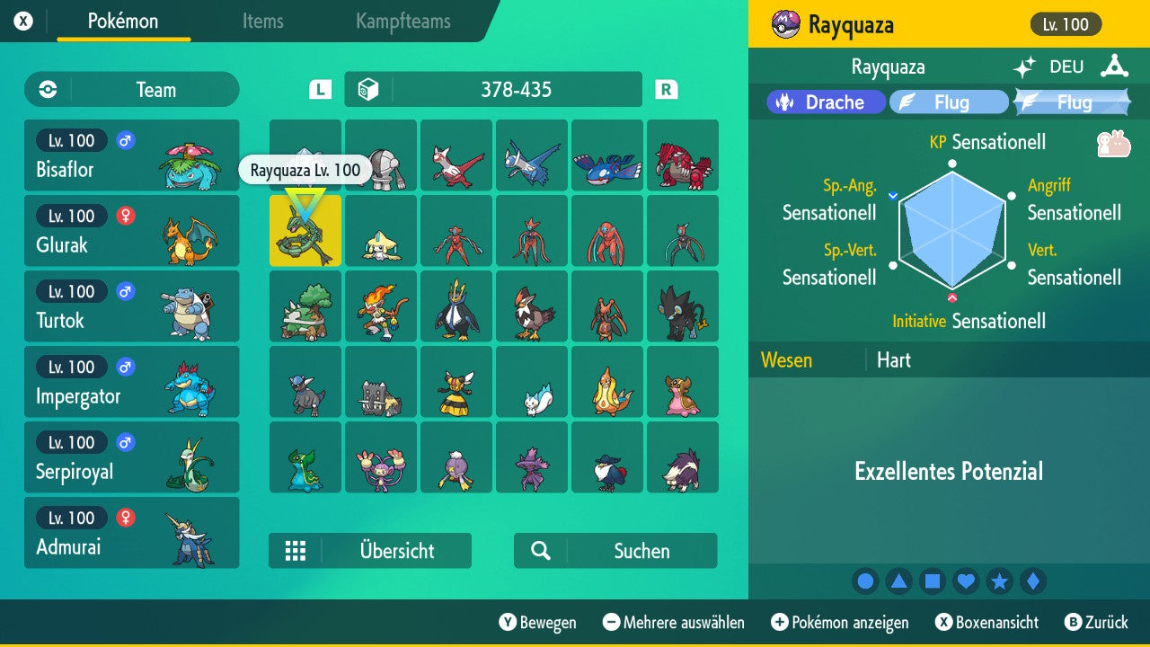 Das Pokemon ist mit beeindruckenden 6×31 IV-Werten ausgestattet. Das bedeutet, dass es auf allen sechs Werten (KP, Ang., Sp-Ang., Vert., Sp-Vert., Init.) die maximalen 31 IV/DV-Punkte besitzt. Dein Pokemon startet somit mit herausragender Stärke in digitale Kämpfe.