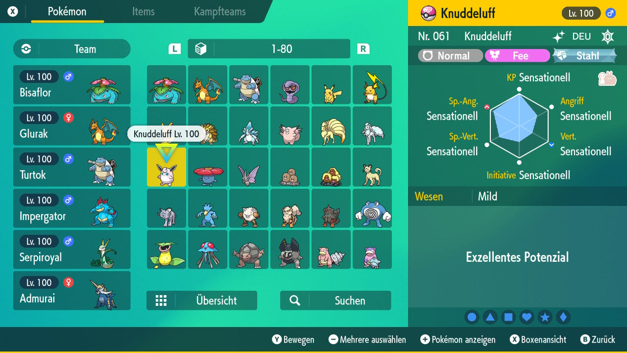 Das Pokemon ist mit beeindruckenden 6×31 IV-Werten ausgestattet. Das bedeutet, dass es auf allen sechs Werten (KP, Ang., Sp-Ang., Vert., Sp-Vert., Init.) die maximalen 31 IV/DV-Punkte besitzt. Dein Pokemon startet somit mit herausragender Stärke in digitale Kämpfe.