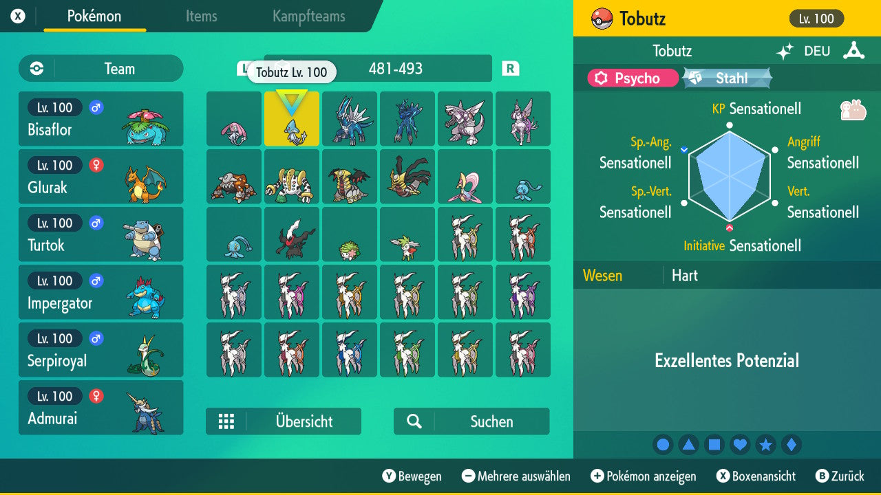 Das Pokemon ist mit beeindruckenden 6×31 IV-Werten ausgestattet. Das bedeutet, dass es auf allen sechs Werten (KP, Ang., Sp-Ang., Vert., Sp-Vert., Init.) die maximalen 31 IV/DV-Punkte besitzt. Dein Pokemon startet somit mit herausragender Stärke in digitale Kämpfe.