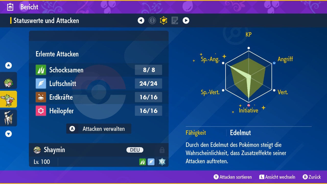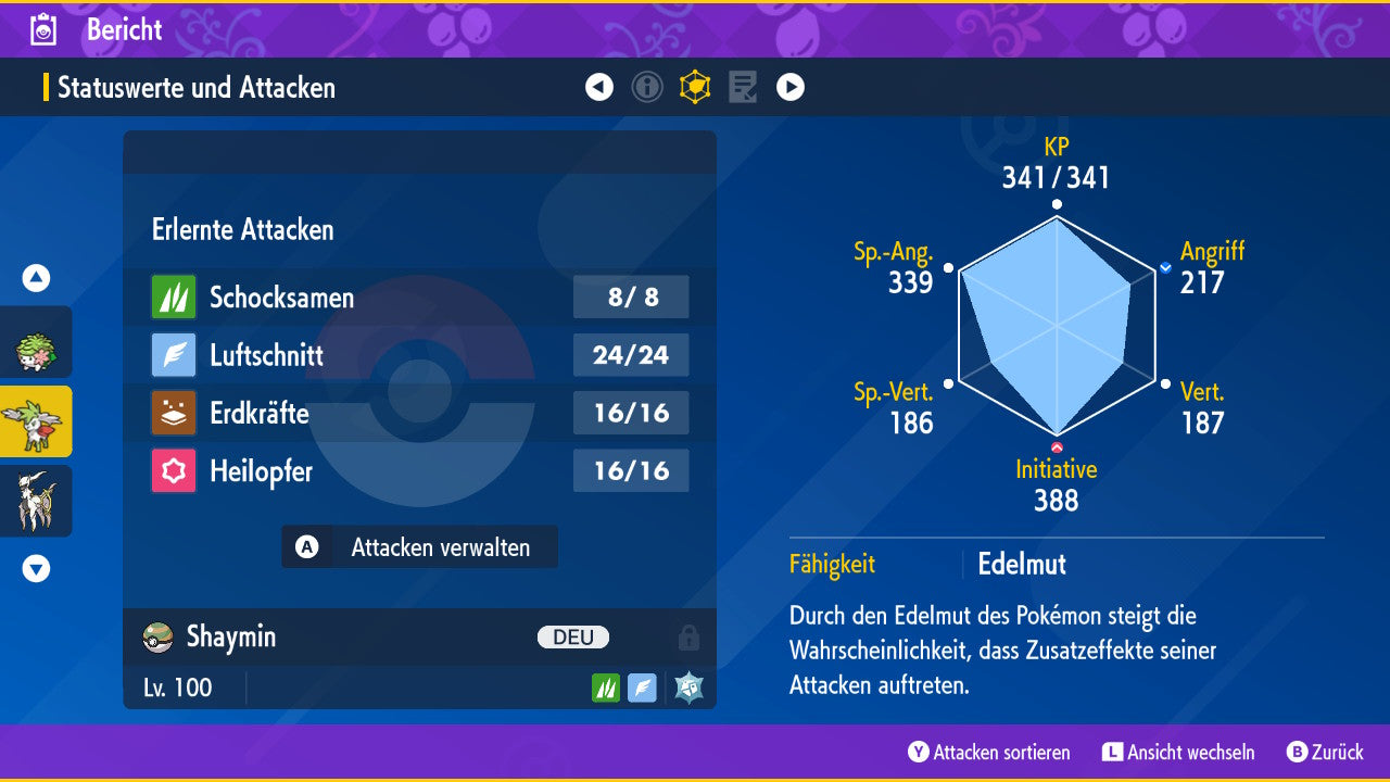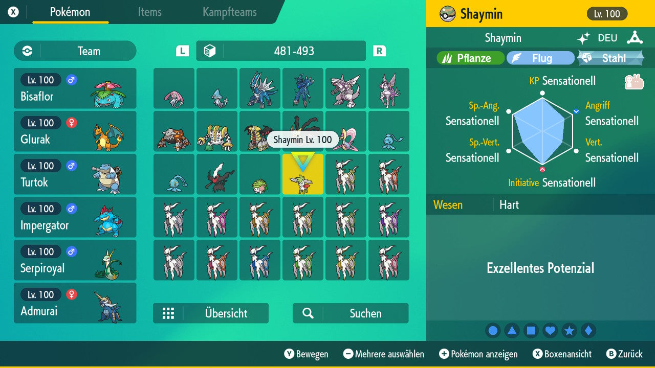Das Pokemon ist mit beeindruckenden 6×31 IV-Werten ausgestattet. Das bedeutet, dass es auf allen sechs Werten (KP, Ang., Sp-Ang., Vert., Sp-Vert., Init.) die maximalen 31 IV/DV-Punkte besitzt. Dein Pokemon startet somit mit herausragender Stärke in digitale Kämpfe.