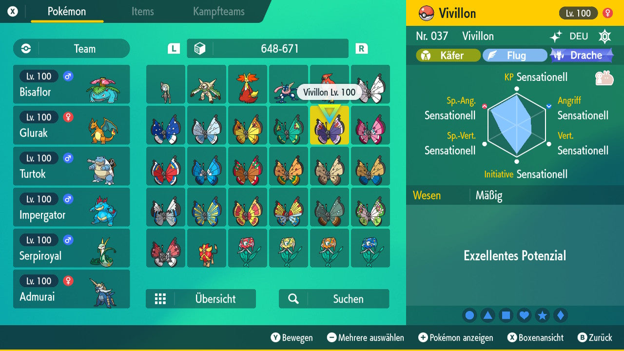 Das Pokemon ist mit beeindruckenden 6×31 IV-Werten ausgestattet. Das bedeutet, dass es auf allen sechs Werten (KP, Ang., Sp-Ang., Vert., Sp-Vert., Init.) die maximalen 31 IV/DV-Punkte besitzt. Dein Pokemon startet somit mit herausragender Stärke in digitale Kämpfe.