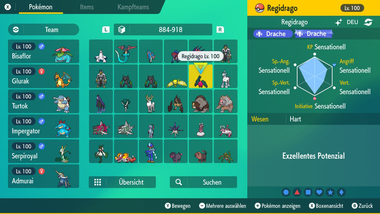 Das Pokemon ist mit beeindruckenden 6×31 IV-Werten ausgestattet. Das bedeutet, dass es auf allen sechs Werten (KP, Ang., Sp-Ang., Vert., Sp-Vert., Init.) die maximalen 31 IV/DV-Punkte besitzt. Dein Pokemon startet somit mit herausragender Stärke in digitale Kämpfe.