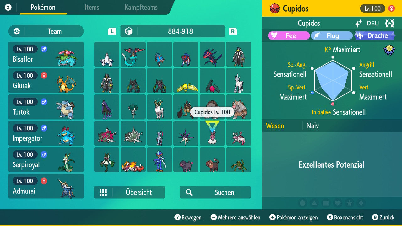 Das Pokemon ist mit beeindruckenden 6×31 IV-Werten ausgestattet. Das bedeutet, dass es auf allen sechs Werten (KP, Ang., Sp-Ang., Vert., Sp-Vert., Init.) die maximalen 31 IV/DV-Punkte besitzt. Dein Pokemon startet somit mit herausragender Stärke in digitale Kämpfe.