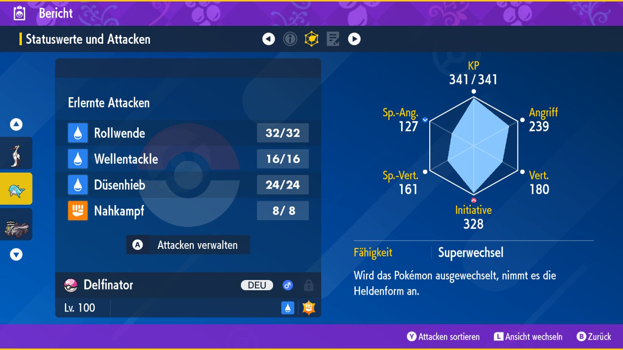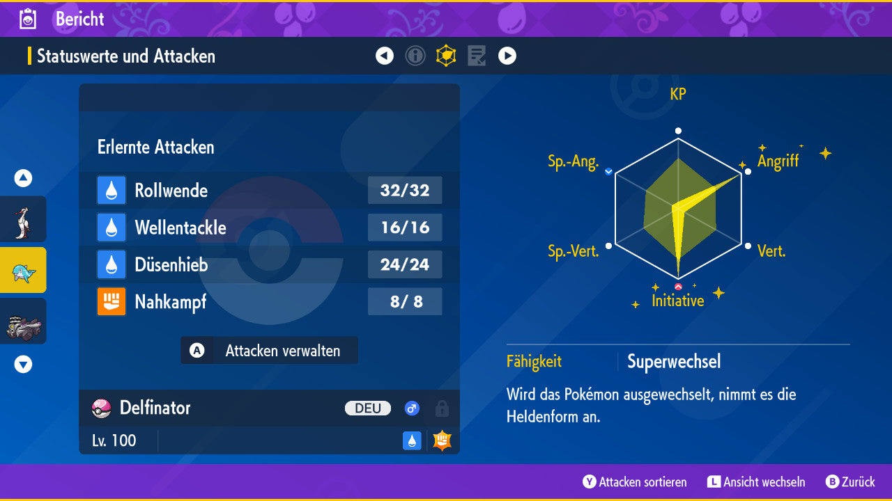 Das Pokemon ist mit beeindruckenden 6×31 IV-Werten ausgestattet. Das bedeutet, dass es auf allen sechs Werten (KP, Ang., Sp-Ang., Vert., Sp-Vert., Init.) die maximalen 31 IV/DV-Punkte besitzt. Dein Pokemon startet somit mit herausragender Stärke in digitale Kämpfe.