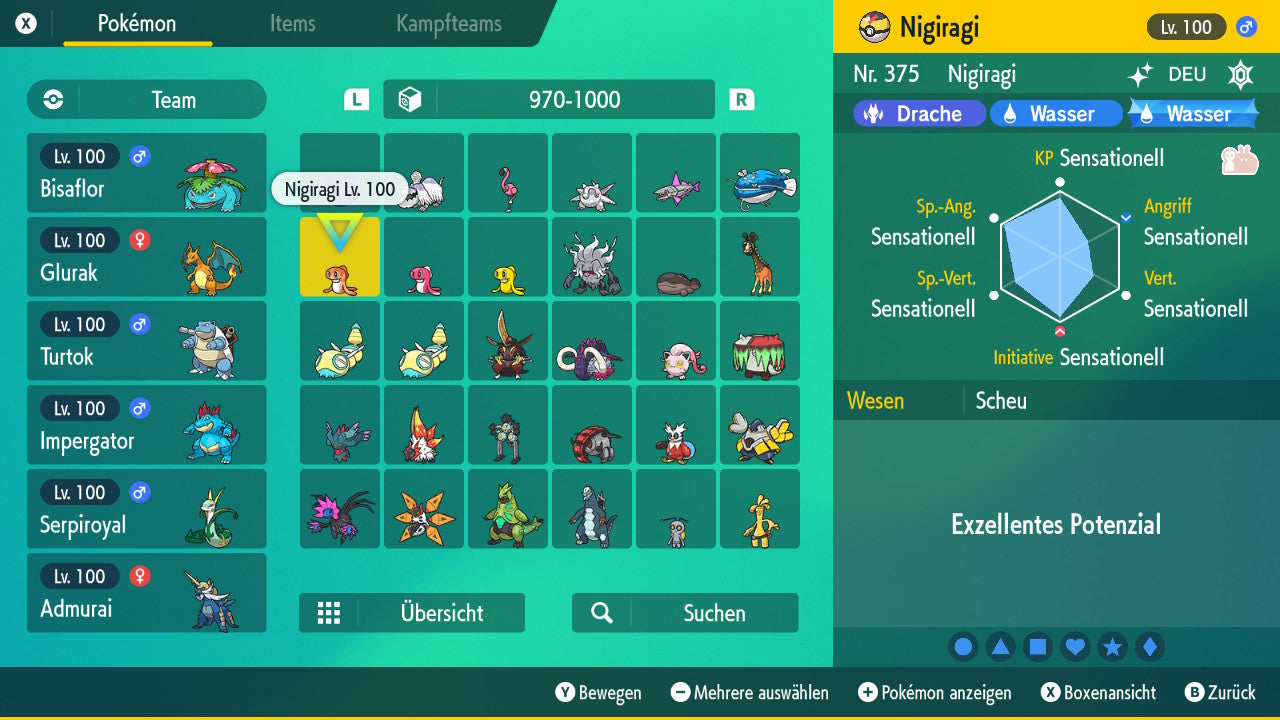 Das Pokemon ist mit beeindruckenden 6×31 IV-Werten ausgestattet. Das bedeutet, dass es auf allen sechs Werten (KP, Ang., Sp-Ang., Vert., Sp-Vert., Init.) die maximalen 31 IV/DV-Punkte besitzt. Dein Pokemon startet somit mit herausragender Stärke in digitale Kämpfe.