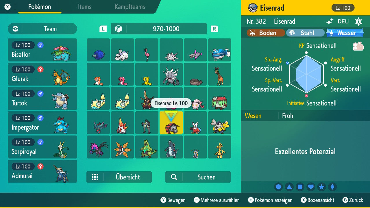 Das Pokemon ist mit beeindruckenden 6×31 IV-Werten ausgestattet. Das bedeutet, dass es auf allen sechs Werten (KP, Ang., Sp-Ang., Vert., Sp-Vert., Init.) die maximalen 31 IV/DV-Punkte besitzt. Dein Pokemon startet somit mit herausragender Stärke in digitale Kämpfe.