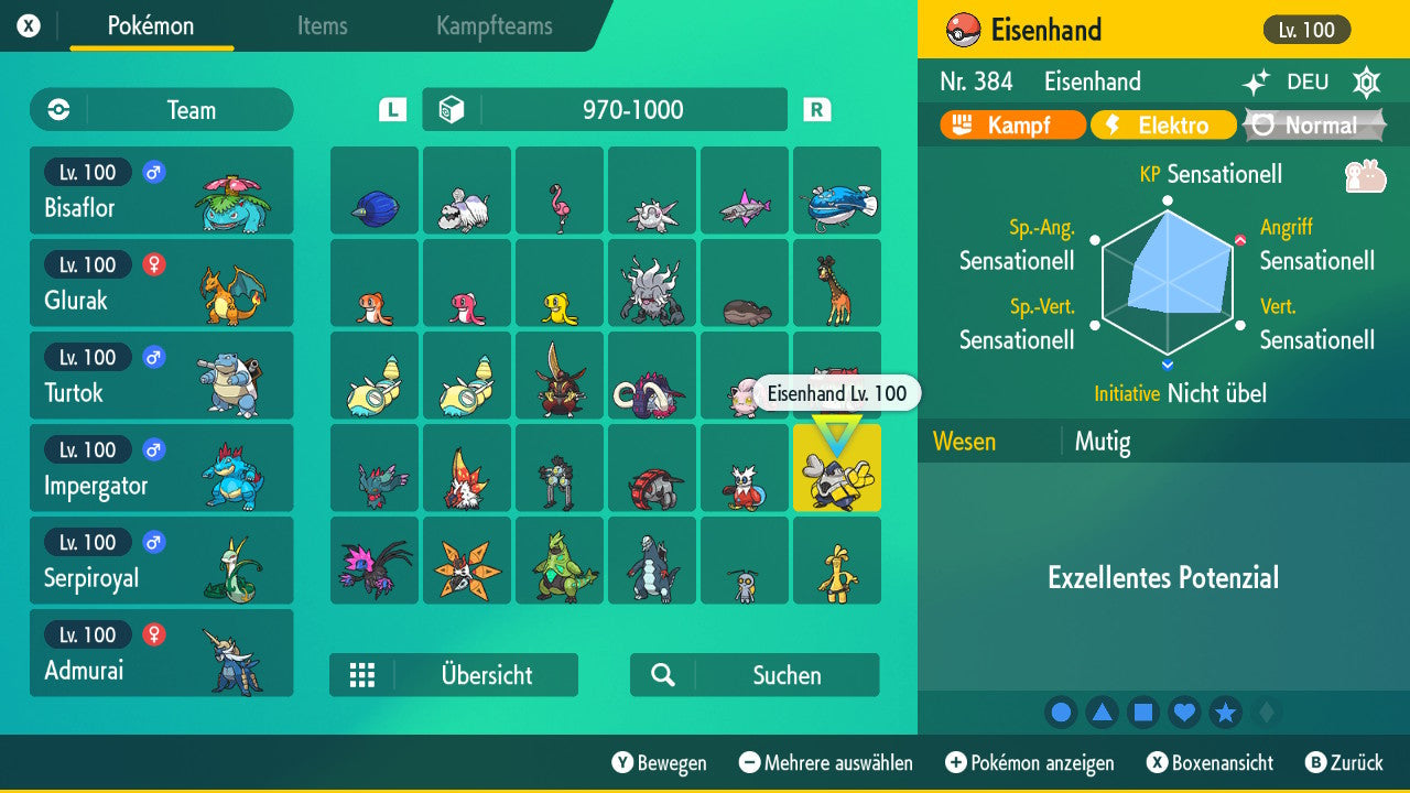 Das Pokemon ist mit beeindruckenden 6×31 IV-Werten ausgestattet. Das bedeutet, dass es auf allen sechs Werten (KP, Ang., Sp-Ang., Vert., Sp-Vert., Init.) die maximalen 31 IV/DV-Punkte besitzt. Dein Pokemon startet somit mit herausragender Stärke in digitale Kämpfe.