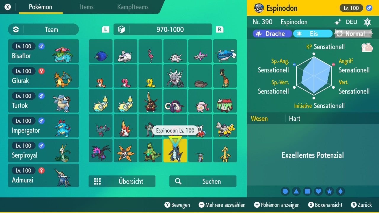 Das Pokemon ist mit beeindruckenden 6×31 IV-Werten ausgestattet. Das bedeutet, dass es auf allen sechs Werten (KP, Ang., Sp-Ang., Vert., Sp-Vert., Init.) die maximalen 31 IV/DV-Punkte besitzt. Dein Pokemon startet somit mit herausragender Stärke in digitale Kämpfe.