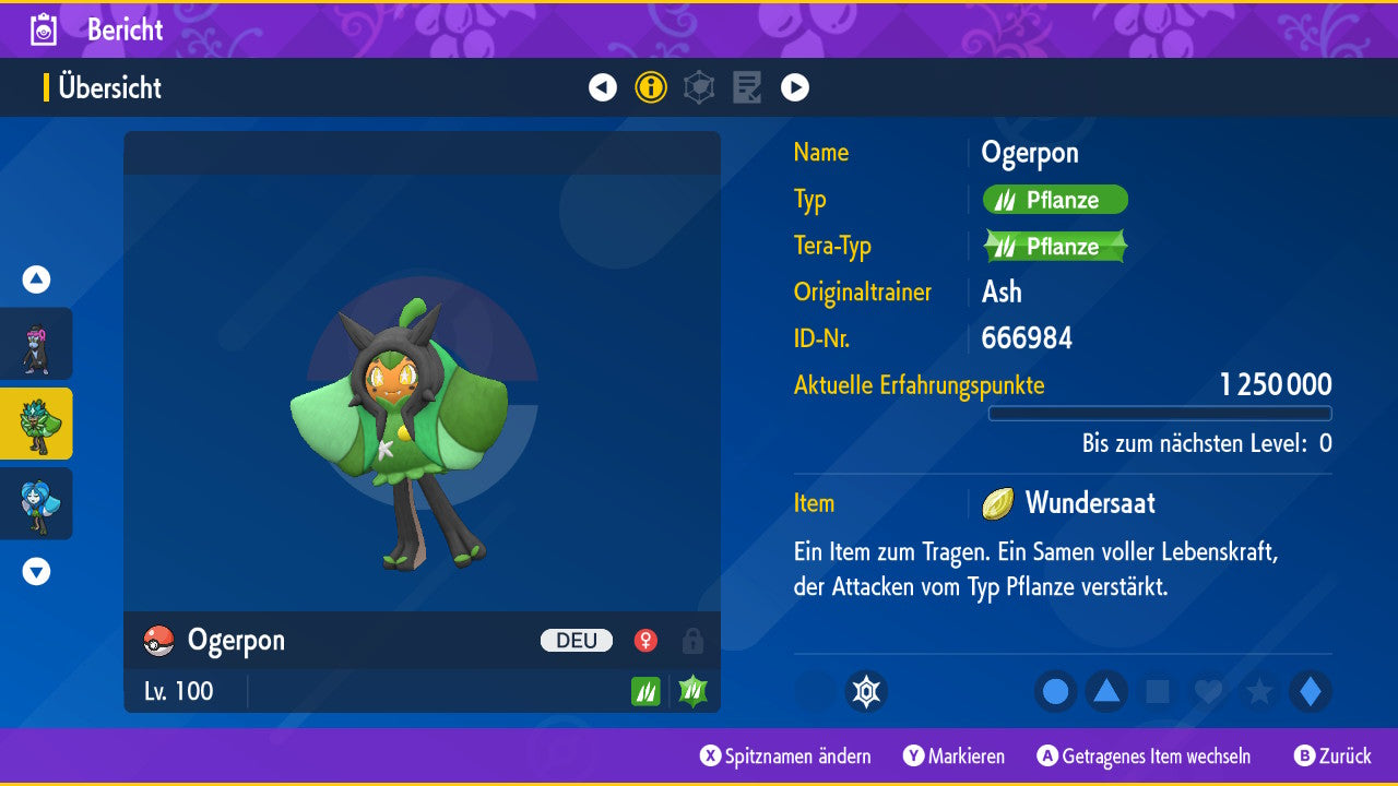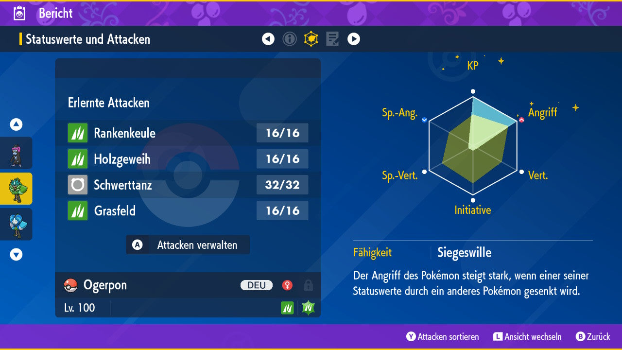 - EV (Effort Values): KP+Atk./Sp.Atk. Maximiert, 510.