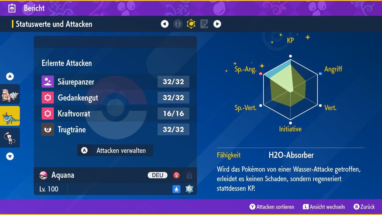 Das Pokemon ist mit beeindruckenden 6×31 IV-Werten ausgestattet. Das bedeutet, dass es auf allen sechs Werten (KP, Ang., Sp-Ang., Vert., Sp-Vert., Init.) die maximalen 31 IV/DV-Punkte besitzt. Dein Pokemon startet somit mit herausragender Stärke in digitale Kämpfe.