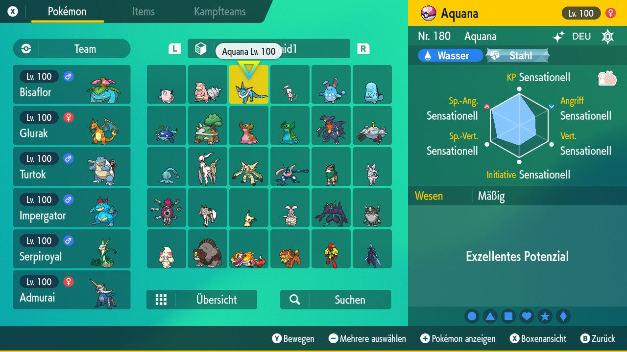 - EV (Effort Values): KP+Atk./Sp.Atk. Maximiert, 510.