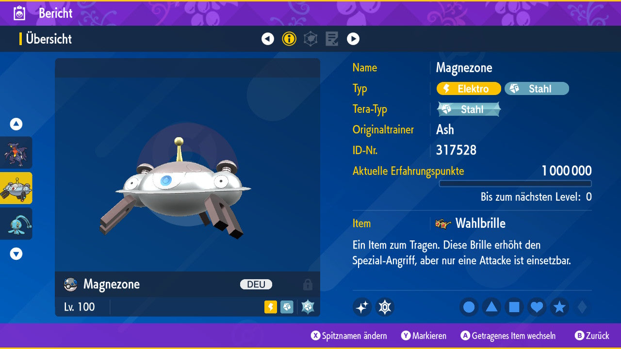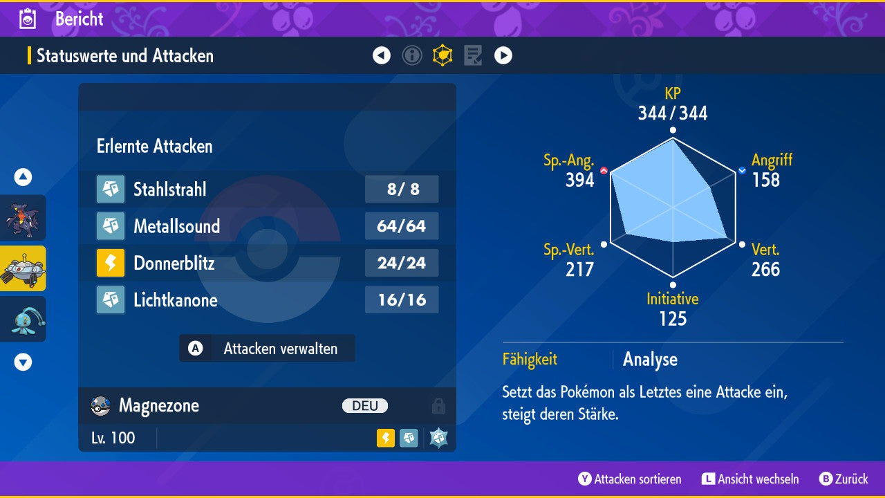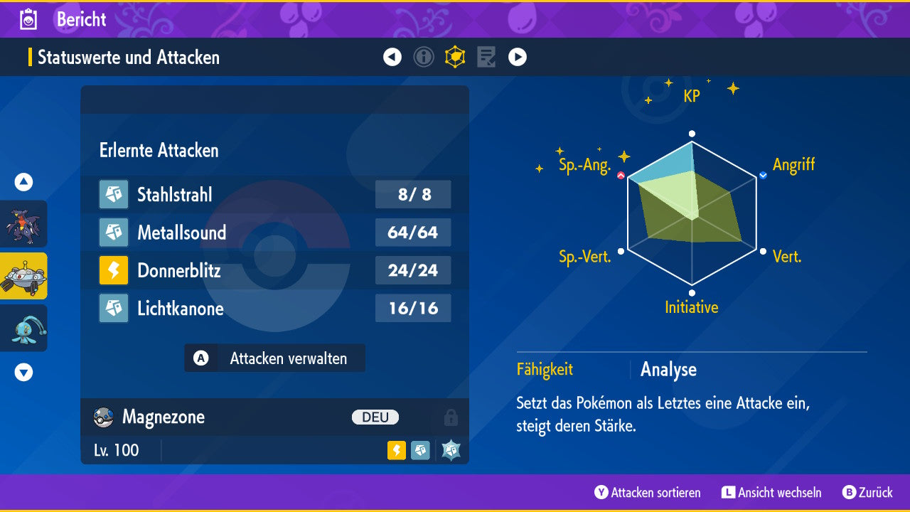 - EV (Effort Values): KP+Atk./Sp.Atk. Maximiert, 510.