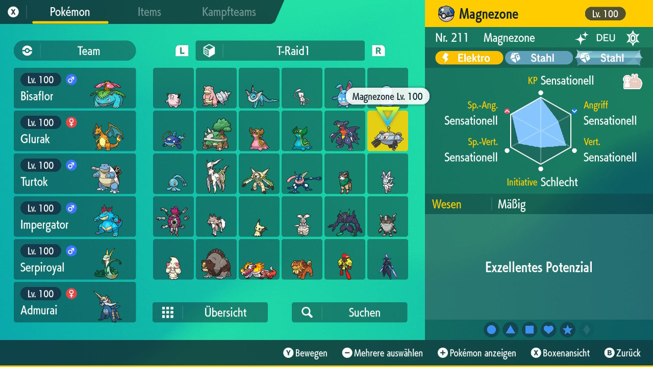 Das Pokemon ist mit beeindruckenden 6×31 IV-Werten ausgestattet. Das bedeutet, dass es auf allen sechs Werten (KP, Ang., Sp-Ang., Vert., Sp-Vert., Init.) die maximalen 31 IV/DV-Punkte besitzt. Dein Pokemon startet somit mit herausragender Stärke in digitale Kämpfe.