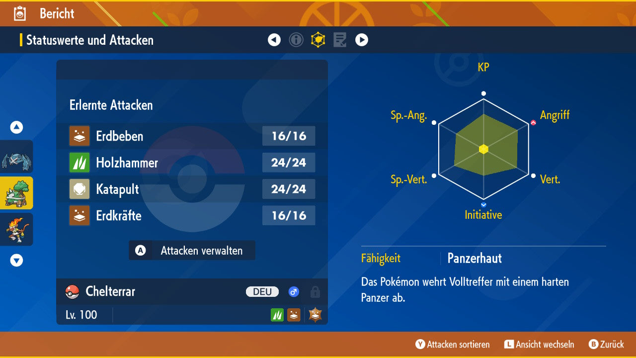 Das Pokemon ist mit beeindruckenden 6×31 IV-Werten ausgestattet. Das bedeutet, dass es auf allen sechs Werten (KP, Ang., Sp-Ang., Vert., Sp-Vert., Init.) die maximalen 31 IV/DV-Punkte besitzt. Dein Pokemon startet somit mit herausragender Stärke in digitale Kämpfe.
