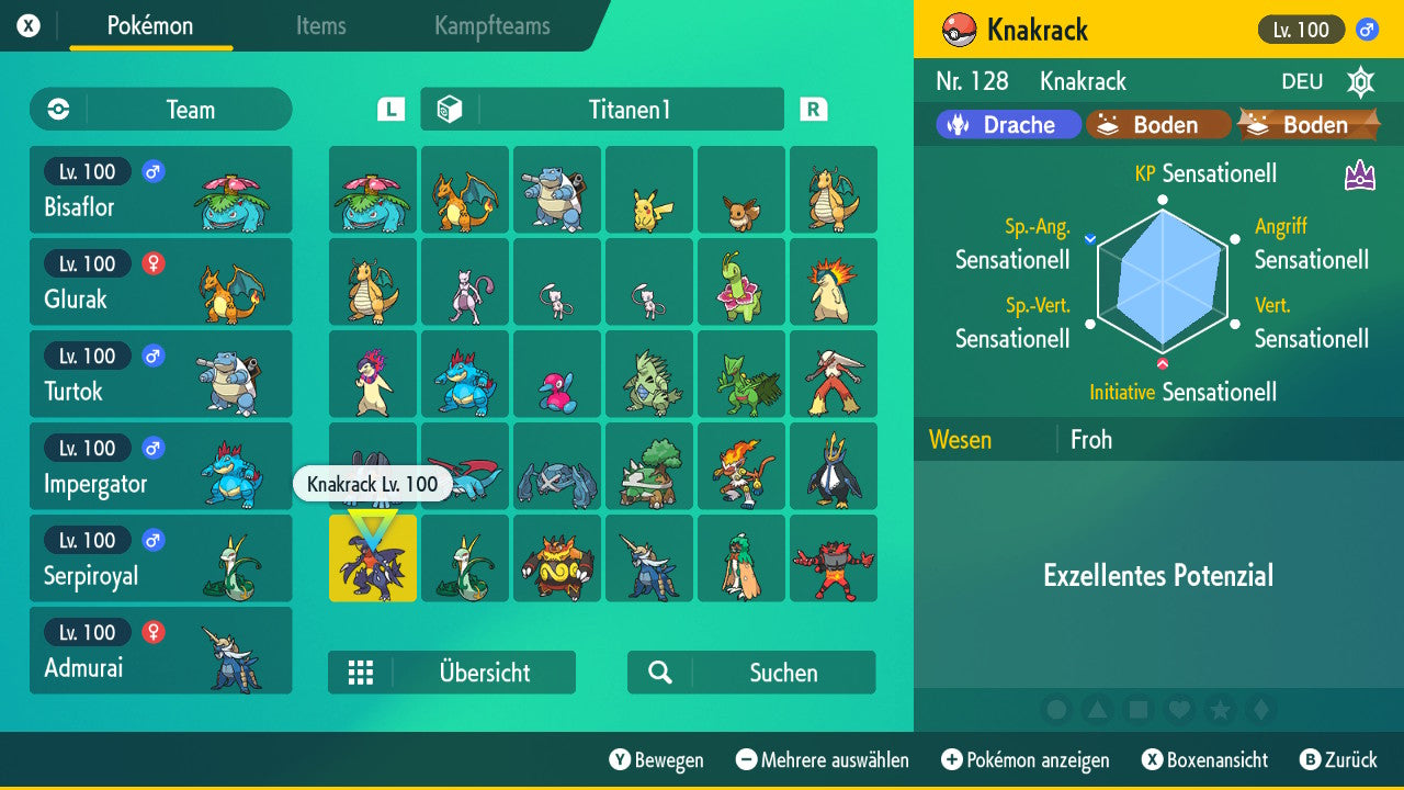 Das Pokemon ist mit beeindruckenden 6×31 IV-Werten ausgestattet. Das bedeutet, dass es auf allen sechs Werten (KP, Ang., Sp-Ang., Vert., Sp-Vert., Init.) die maximalen 31 IV/DV-Punkte besitzt. Dein Pokemon startet somit mit herausragender Stärke in digitale Kämpfe.