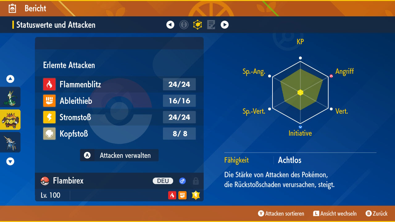 Das Pokemon ist mit beeindruckenden 6×31 IV-Werten ausgestattet. Das bedeutet, dass es auf allen sechs Werten (KP, Ang., Sp-Ang., Vert., Sp-Vert., Init.) die maximalen 31 IV/DV-Punkte besitzt. Dein Pokemon startet somit mit herausragender Stärke in digitale Kämpfe.