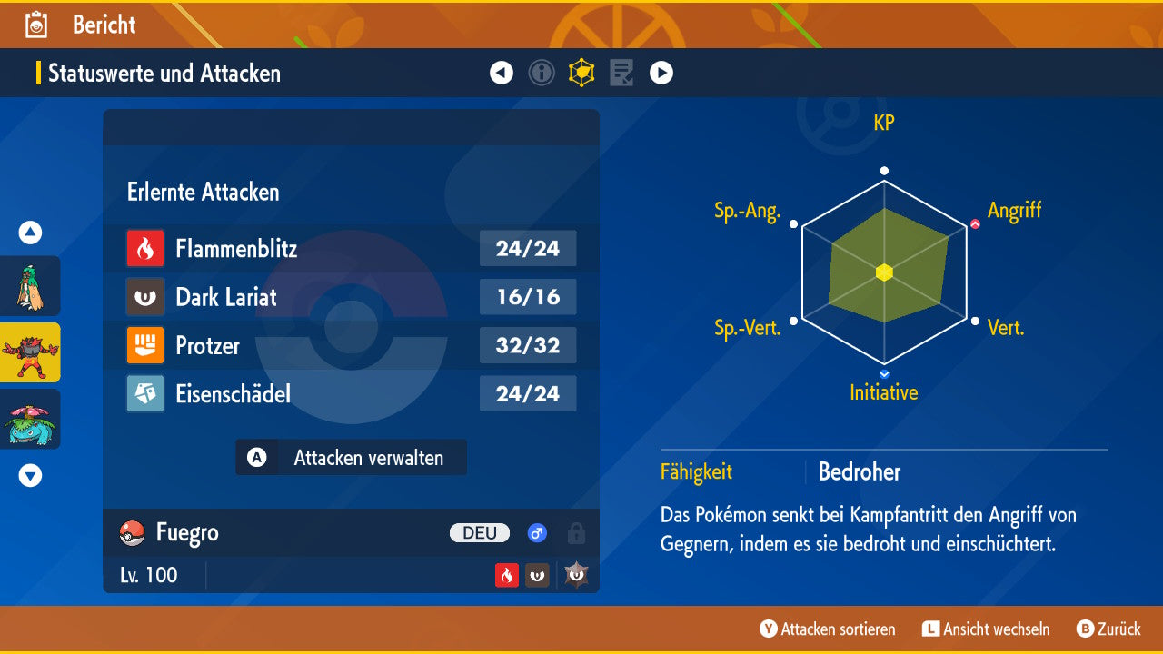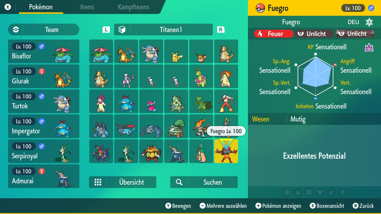 Das Pokemon ist mit beeindruckenden 6×31 IV-Werten ausgestattet. Das bedeutet, dass es auf allen sechs Werten (KP, Ang., Sp-Ang., Vert., Sp-Vert., Init.) die maximalen 31 IV/DV-Punkte besitzt. Dein Pokemon startet somit mit herausragender Stärke in digitale Kämpfe.