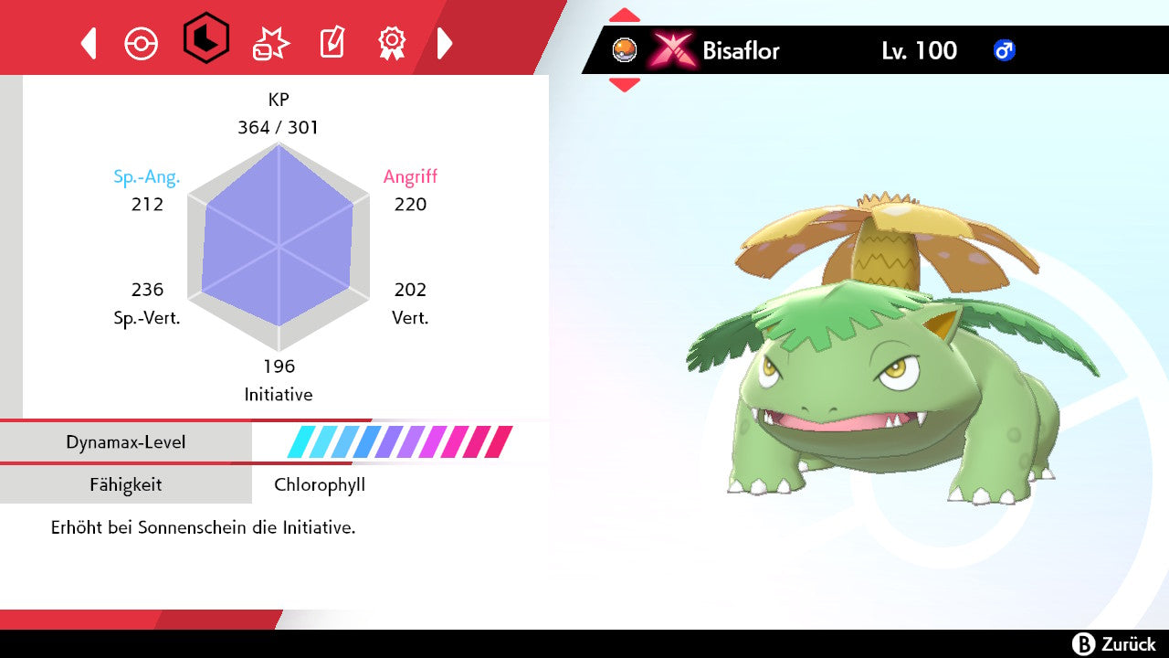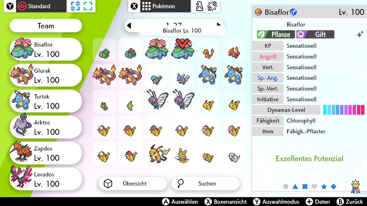 Das Pokemon ist mit beeindruckenden 6×31 IV-Werten ausgestattet. Das bedeutet, dass es auf allen sechs Werten (KP, Ang., Sp-Ang., Vert., Sp-Vert., Init.) die maximalen 31 IV/DV-Punkte besitzt. Dein Pokemon startet somit mit herausragender Stärke in digitale Kämpfe.