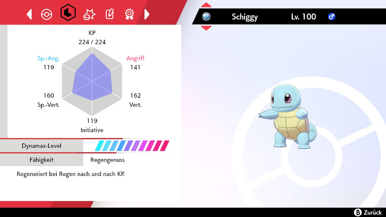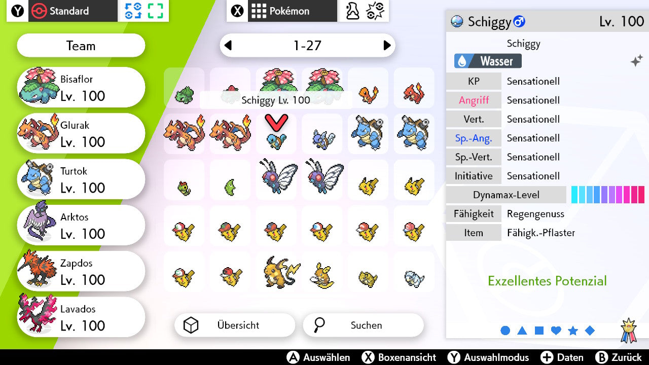 Das Pokemon ist mit beeindruckenden 6×31 IV-Werten ausgestattet. Das bedeutet, dass es auf allen sechs Werten (KP, Ang., Sp-Ang., Vert., Sp-Vert., Init.) die maximalen 31 IV/DV-Punkte besitzt. Dein Pokemon startet somit mit herausragender Stärke in digitale Kämpfe.