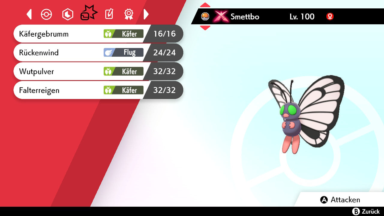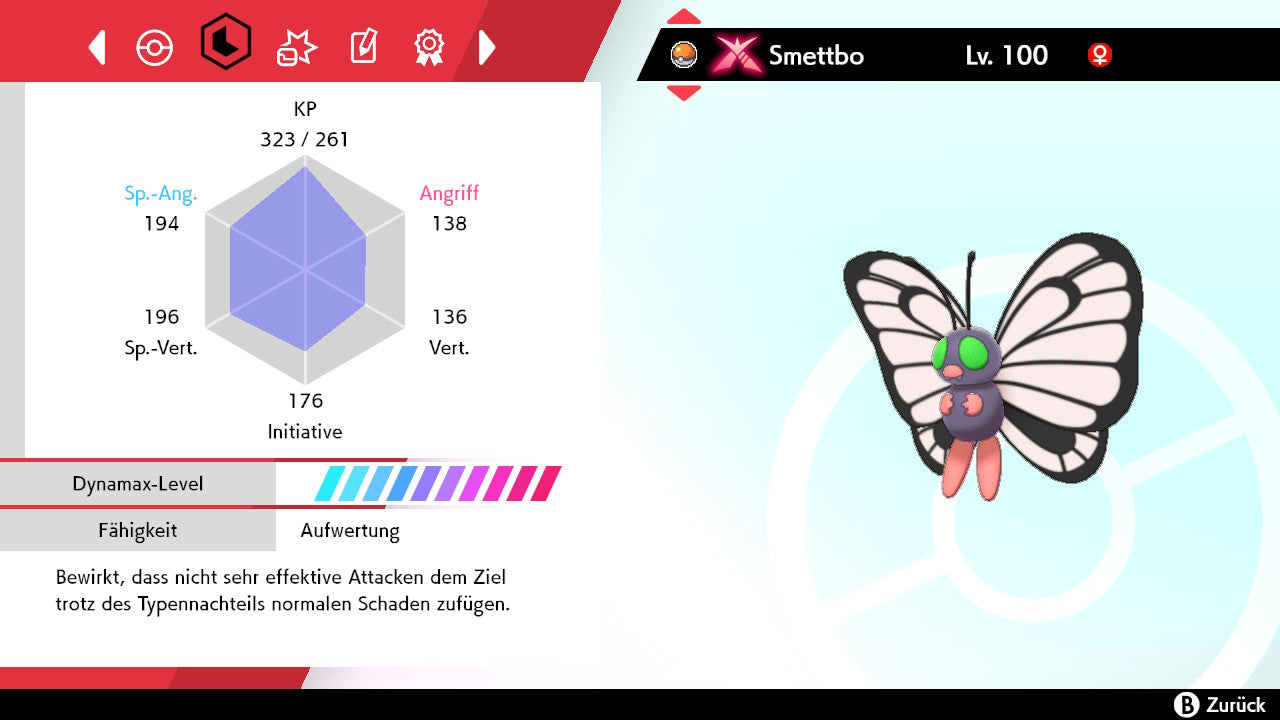 Das Pokemon ist mit beeindruckenden 6×31 IV-Werten ausgestattet. Das bedeutet, dass es auf allen sechs Werten (KP, Ang., Sp-Ang., Vert., Sp-Vert., Init.) die maximalen 31 IV/DV-Punkte besitzt. Dein Pokemon startet somit mit herausragender Stärke in digitale Kämpfe.
