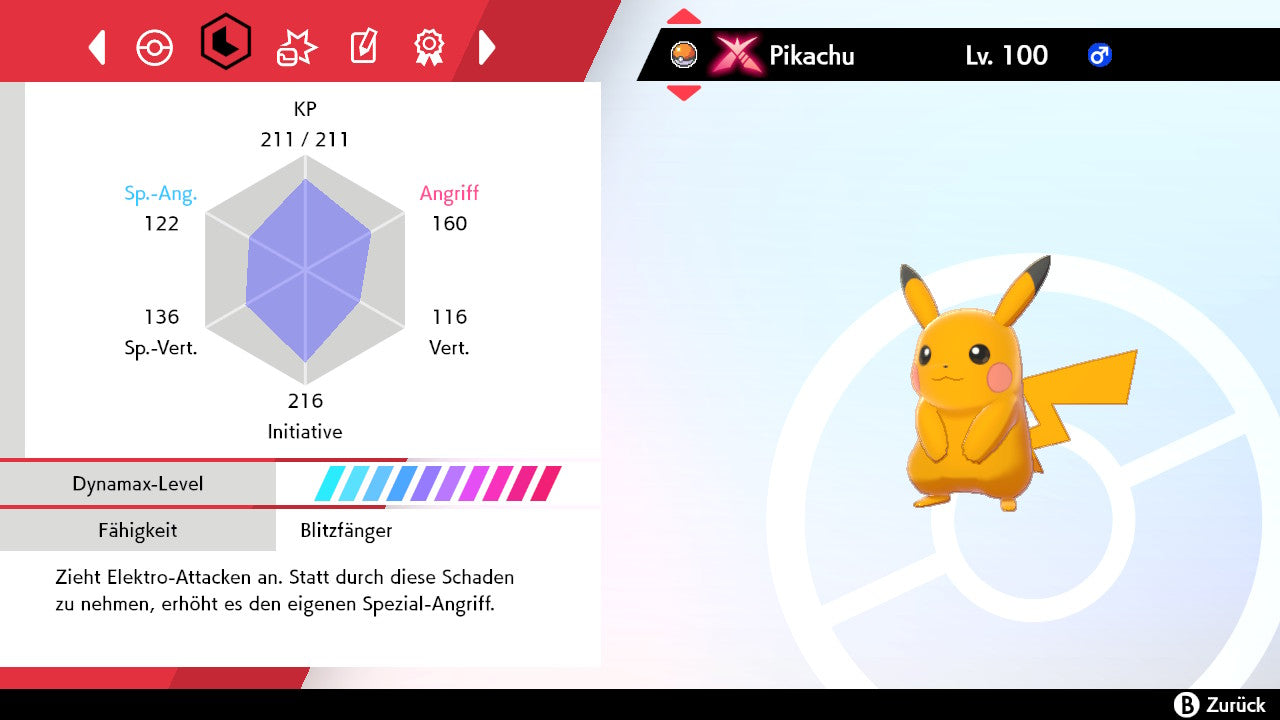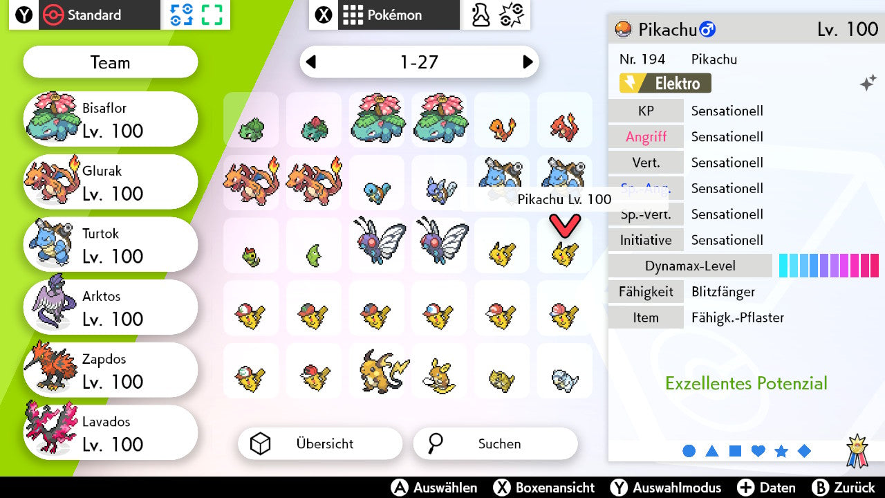 Das Pokemon ist mit beeindruckenden 6×31 IV-Werten ausgestattet. Das bedeutet, dass es auf allen sechs Werten (KP, Ang., Sp-Ang., Vert., Sp-Vert., Init.) die maximalen 31 IV/DV-Punkte besitzt. Dein Pokemon startet somit mit herausragender Stärke in digitale Kämpfe.