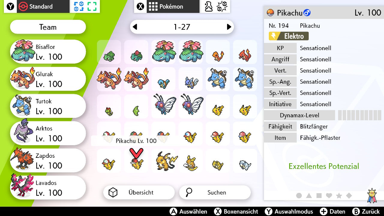 Das Pokemon ist mit beeindruckenden 6×31 IV-Werten ausgestattet. Das bedeutet, dass es auf allen sechs Werten (KP, Ang., Sp-Ang., Vert., Sp-Vert., Init.) die maximalen 31 IV/DV-Punkte besitzt. Dein Pokemon startet somit mit herausragender Stärke in digitale Kämpfe.