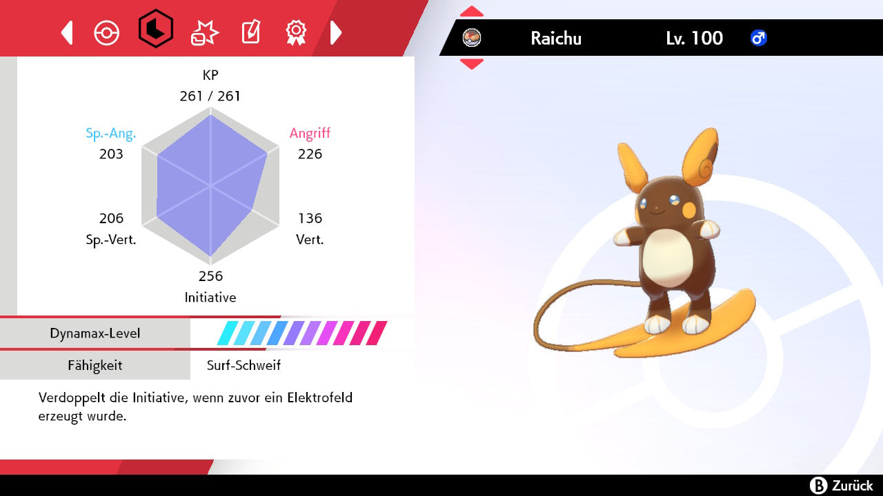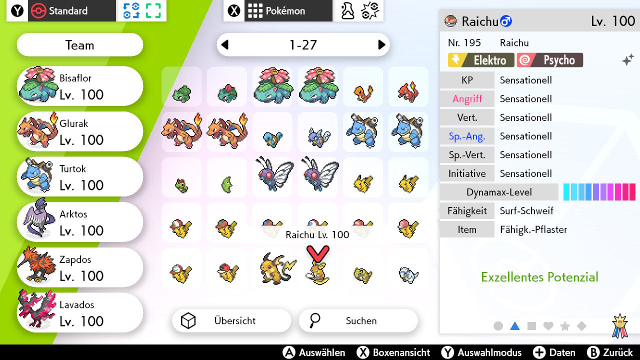 Das Pokemon ist mit beeindruckenden 6×31 IV-Werten ausgestattet. Das bedeutet, dass es auf allen sechs Werten (KP, Ang., Sp-Ang., Vert., Sp-Vert., Init.) die maximalen 31 IV/DV-Punkte besitzt. Dein Pokemon startet somit mit herausragender Stärke in digitale Kämpfe.