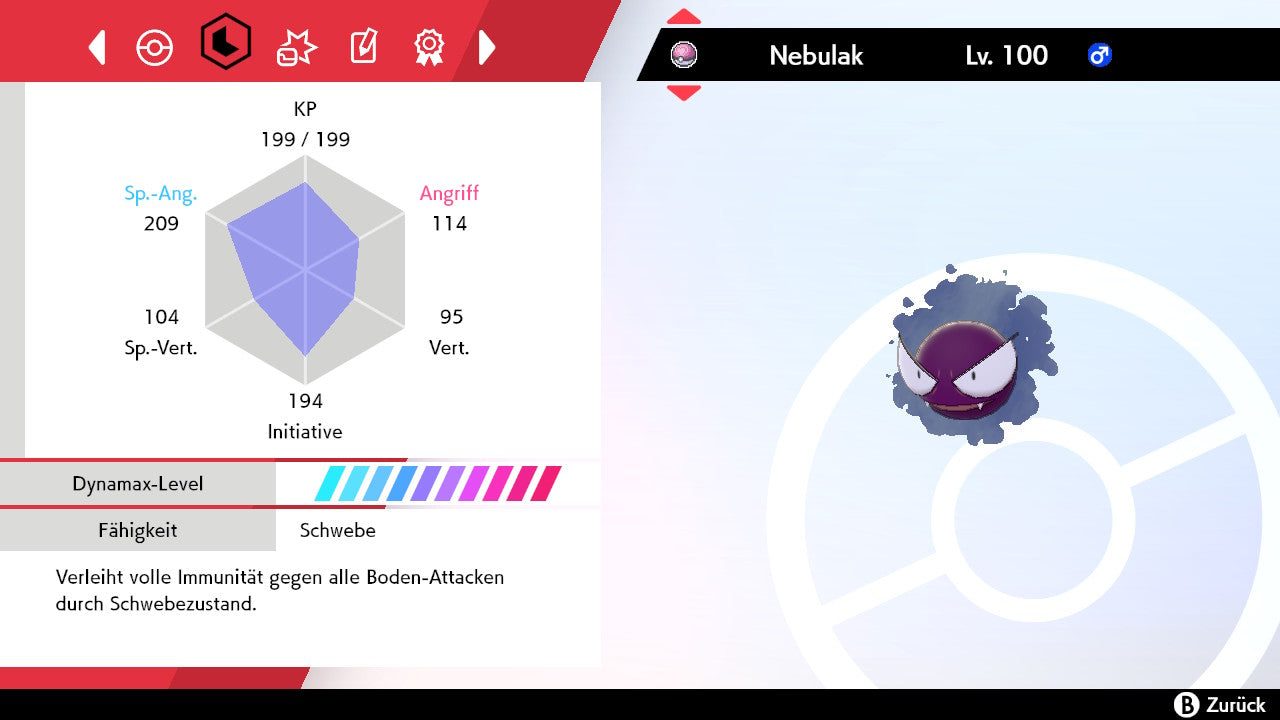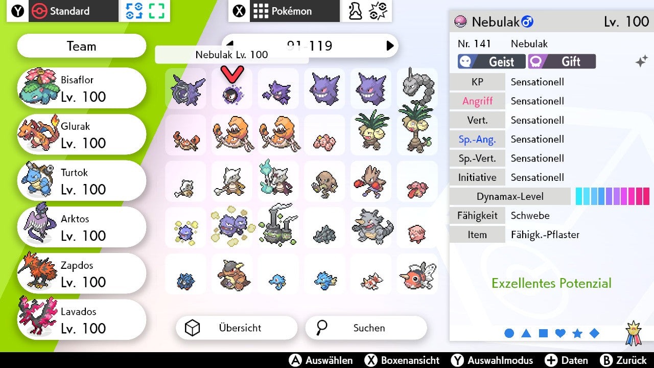 Das Pokemon ist mit beeindruckenden 6×31 IV-Werten ausgestattet. Das bedeutet, dass es auf allen sechs Werten (KP, Ang., Sp-Ang., Vert., Sp-Vert., Init.) die maximalen 31 IV/DV-Punkte besitzt. Dein Pokemon startet somit mit herausragender Stärke in digitale Kämpfe.