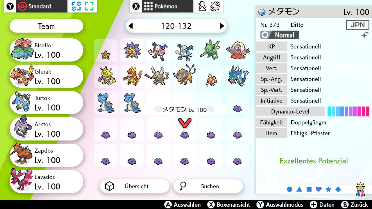 Das Pokemon ist mit beeindruckenden 6×31 IV-Werten ausgestattet. Das bedeutet, dass es auf allen sechs Werten (KP, Ang., Sp-Ang., Vert., Sp-Vert., Init.) die maximalen 31 IV/DV-Punkte besitzt. Dein Pokemon startet somit mit herausragender Stärke in digitale Kämpfe.