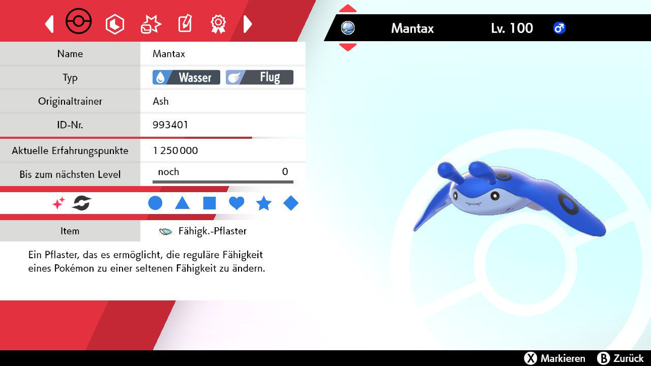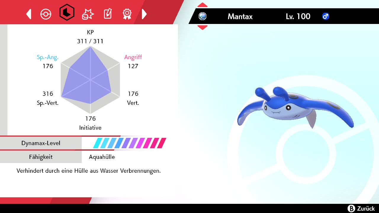 Das Pokemon ist mit beeindruckenden 6×31 IV-Werten ausgestattet. Das bedeutet, dass es auf allen sechs Werten (KP, Ang., Sp-Ang., Vert., Sp-Vert., Init.) die maximalen 31 IV/DV-Punkte besitzt. Dein Pokemon startet somit mit herausragender Stärke in digitale Kämpfe.