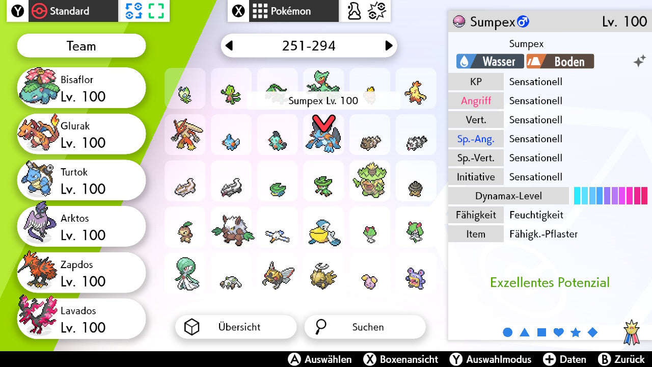 Das Pokemon ist mit beeindruckenden 6×31 IV-Werten ausgestattet. Das bedeutet, dass es auf allen sechs Werten (KP, Ang., Sp-Ang., Vert., Sp-Vert., Init.) die maximalen 31 IV/DV-Punkte besitzt. Dein Pokemon startet somit mit herausragender Stärke in digitale Kämpfe.