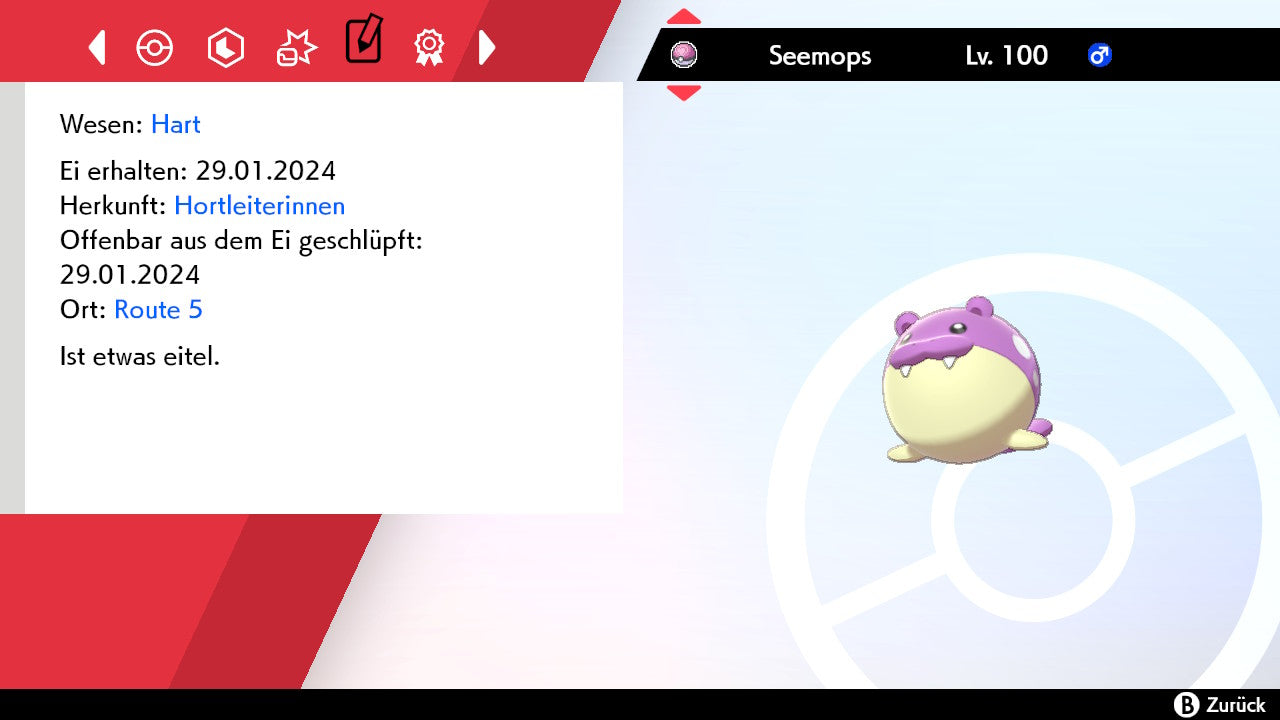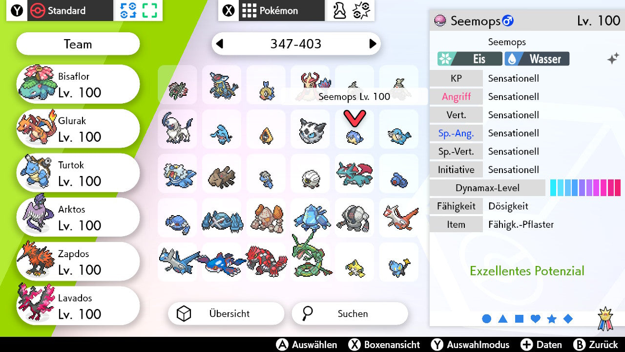 Das Pokemon ist mit beeindruckenden 6×31 IV-Werten ausgestattet. Das bedeutet, dass es auf allen sechs Werten (KP, Ang., Sp-Ang., Vert., Sp-Vert., Init.) die maximalen 31 IV/DV-Punkte besitzt. Dein Pokemon startet somit mit herausragender Stärke in digitale Kämpfe.
