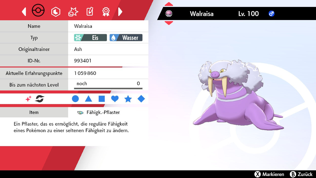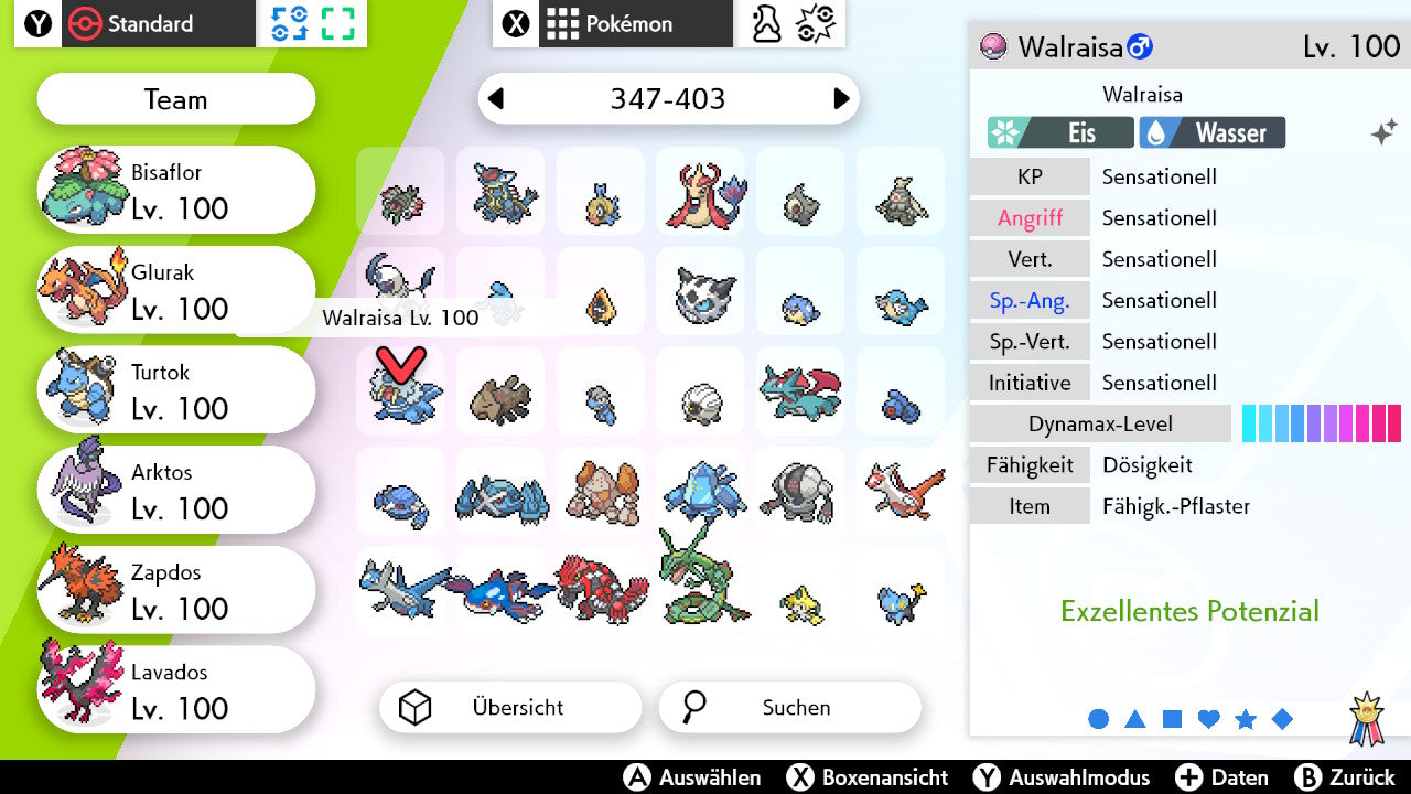 Das Pokemon ist mit beeindruckenden 6×31 IV-Werten ausgestattet. Das bedeutet, dass es auf allen sechs Werten (KP, Ang., Sp-Ang., Vert., Sp-Vert., Init.) die maximalen 31 IV/DV-Punkte besitzt. Dein Pokemon startet somit mit herausragender Stärke in digitale Kämpfe.