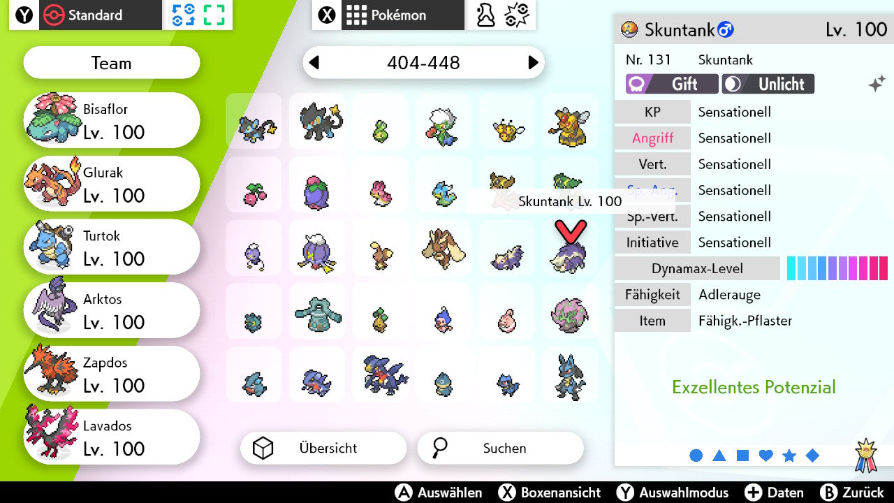 Das Pokemon ist mit beeindruckenden 6×31 IV-Werten ausgestattet. Das bedeutet, dass es auf allen sechs Werten (KP, Ang., Sp-Ang., Vert., Sp-Vert., Init.) die maximalen 31 IV/DV-Punkte besitzt. Dein Pokemon startet somit mit herausragender Stärke in digitale Kämpfe.