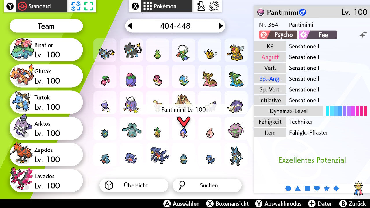 Das Pokemon ist mit beeindruckenden 6×31 IV-Werten ausgestattet. Das bedeutet, dass es auf allen sechs Werten (KP, Ang., Sp-Ang., Vert., Sp-Vert., Init.) die maximalen 31 IV/DV-Punkte besitzt. Dein Pokemon startet somit mit herausragender Stärke in digitale Kämpfe.