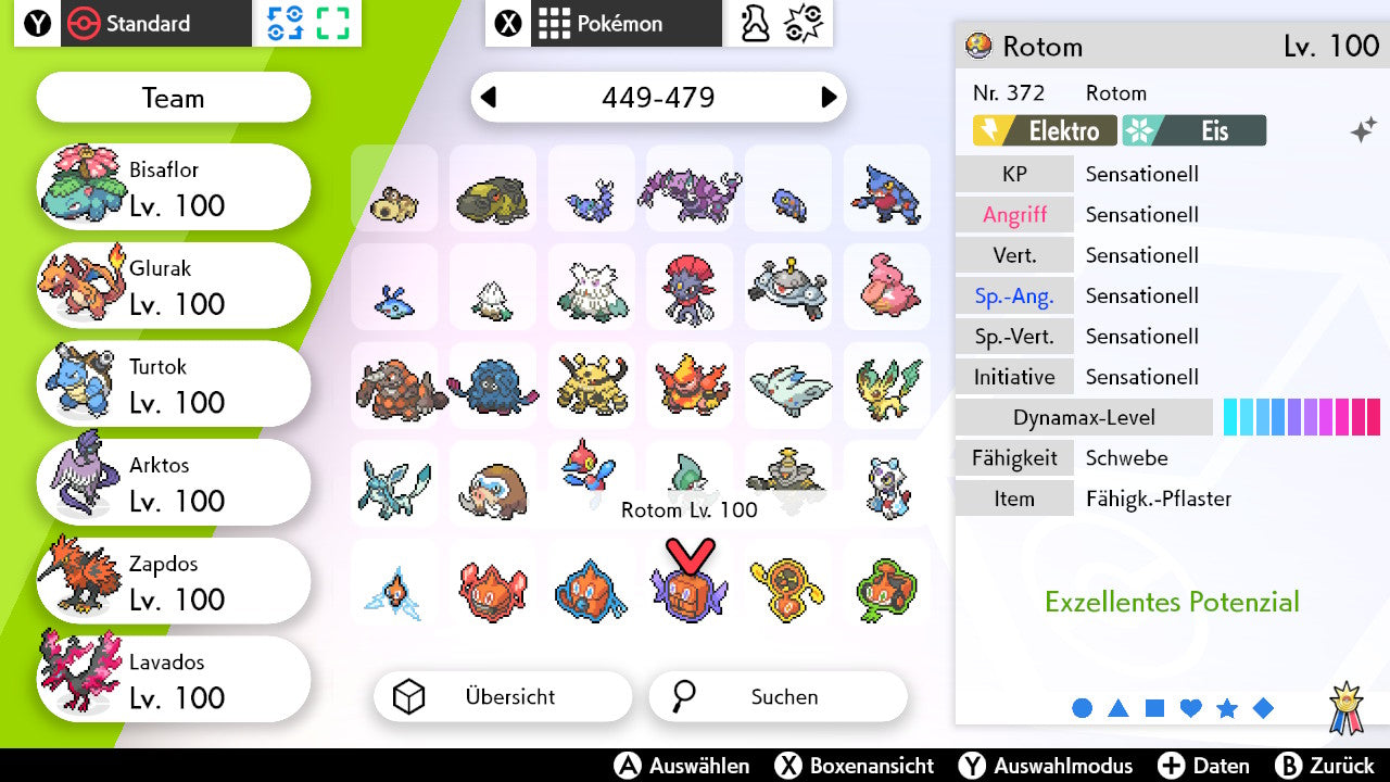 Das Pokemon ist mit beeindruckenden 6×31 IV-Werten ausgestattet. Das bedeutet, dass es auf allen sechs Werten (KP, Ang., Sp-Ang., Vert., Sp-Vert., Init.) die maximalen 31 IV/DV-Punkte besitzt. Dein Pokemon startet somit mit herausragender Stärke in digitale Kämpfe.
