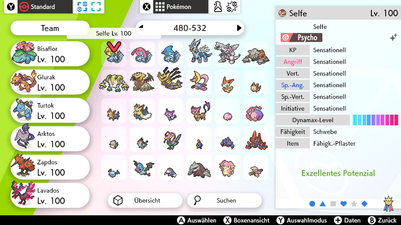 Das Pokemon ist mit beeindruckenden 6×31 IV-Werten ausgestattet. Das bedeutet, dass es auf allen sechs Werten (KP, Ang., Sp-Ang., Vert., Sp-Vert., Init.) die maximalen 31 IV/DV-Punkte besitzt. Dein Pokemon startet somit mit herausragender Stärke in digitale Kämpfe.