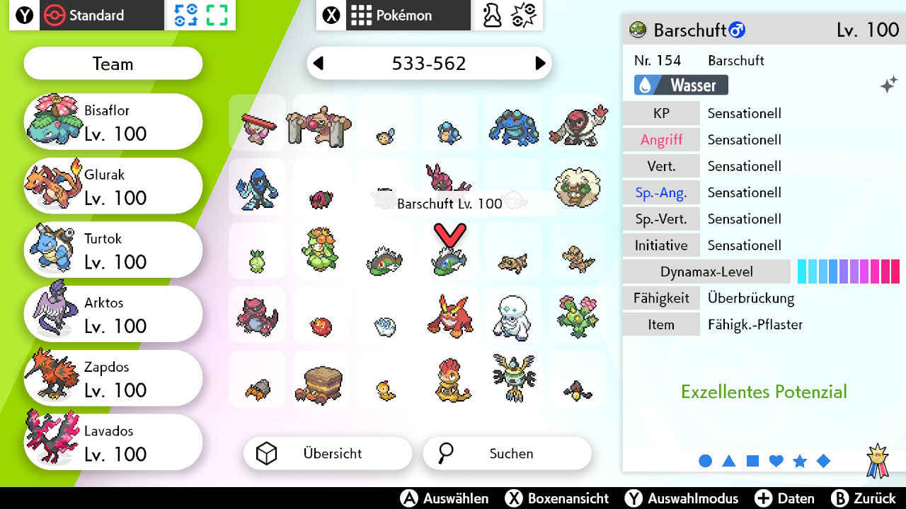 Das Pokemon ist mit beeindruckenden 6×31 IV-Werten ausgestattet. Das bedeutet, dass es auf allen sechs Werten (KP, Ang., Sp-Ang., Vert., Sp-Vert., Init.) die maximalen 31 IV/DV-Punkte besitzt. Dein Pokemon startet somit mit herausragender Stärke in digitale Kämpfe.