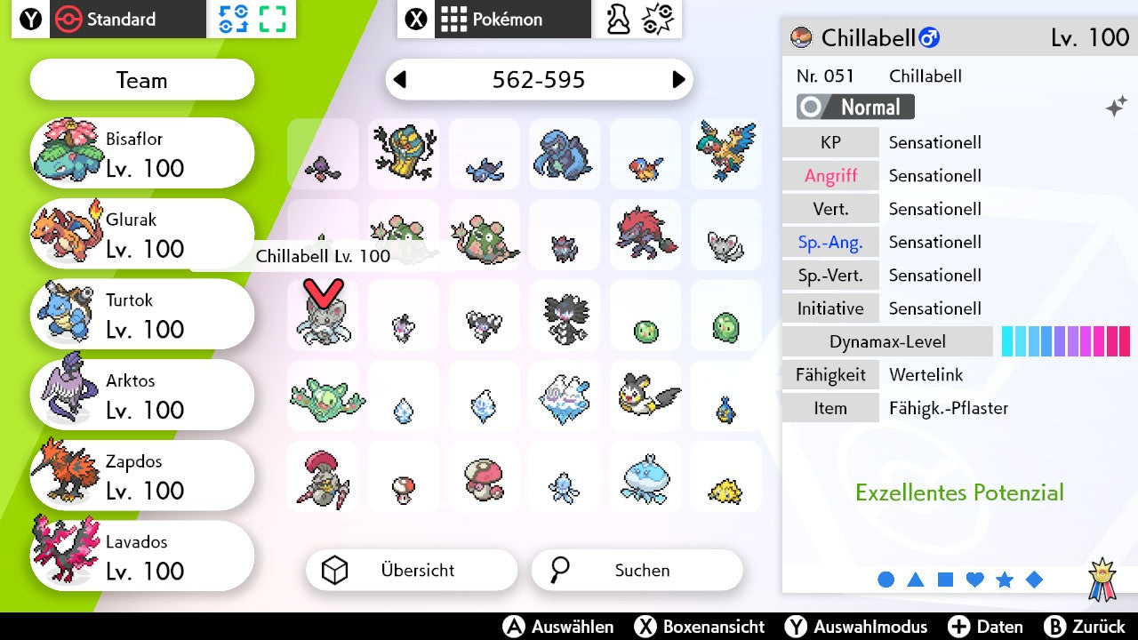 Das Pokemon ist mit beeindruckenden 6×31 IV-Werten ausgestattet. Das bedeutet, dass es auf allen sechs Werten (KP, Ang., Sp-Ang., Vert., Sp-Vert., Init.) die maximalen 31 IV/DV-Punkte besitzt. Dein Pokemon startet somit mit herausragender Stärke in digitale Kämpfe.