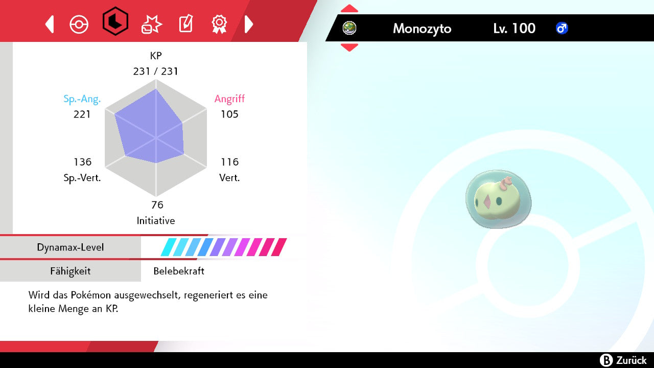 Das Pokemon ist mit beeindruckenden 6×31 IV-Werten ausgestattet. Das bedeutet, dass es auf allen sechs Werten (KP, Ang., Sp-Ang., Vert., Sp-Vert., Init.) die maximalen 31 IV/DV-Punkte besitzt. Dein Pokemon startet somit mit herausragender Stärke in digitale Kämpfe.