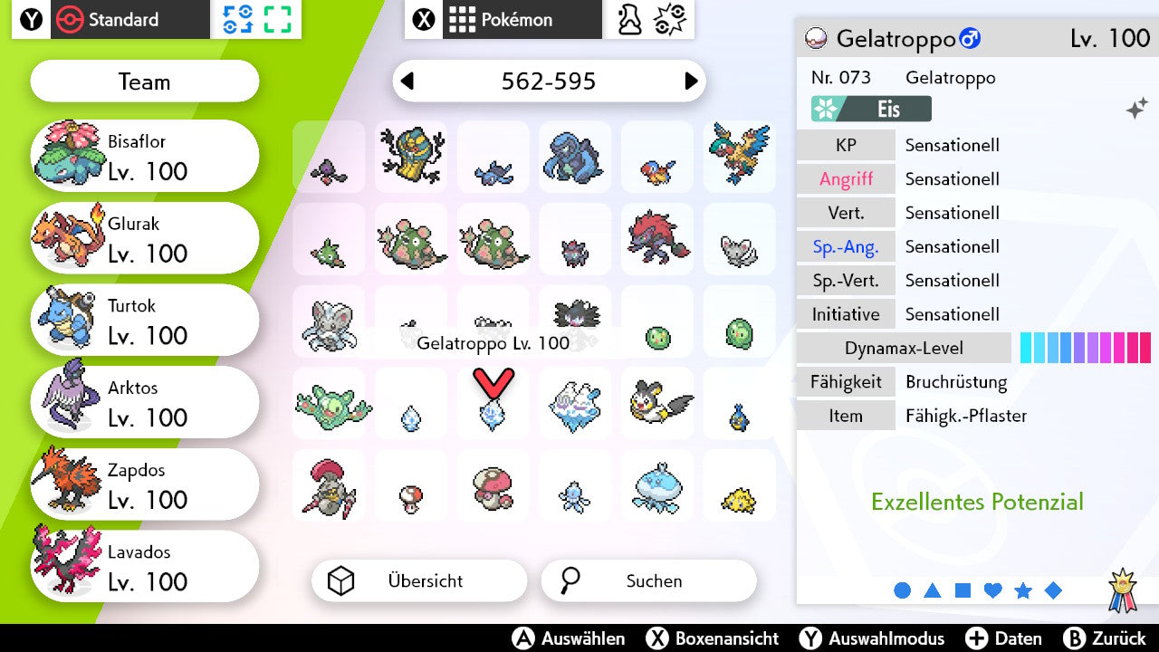 Das Pokemon ist mit beeindruckenden 6×31 IV-Werten ausgestattet. Das bedeutet, dass es auf allen sechs Werten (KP, Ang., Sp-Ang., Vert., Sp-Vert., Init.) die maximalen 31 IV/DV-Punkte besitzt. Dein Pokemon startet somit mit herausragender Stärke in digitale Kämpfe.