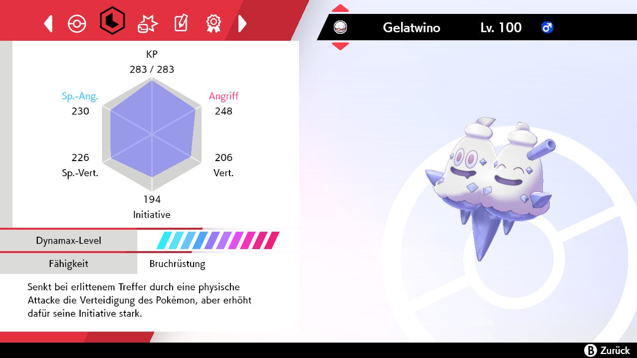 Das Pokemon ist mit beeindruckenden 6×31 IV-Werten ausgestattet. Das bedeutet, dass es auf allen sechs Werten (KP, Ang., Sp-Ang., Vert., Sp-Vert., Init.) die maximalen 31 IV/DV-Punkte besitzt. Dein Pokemon startet somit mit herausragender Stärke in digitale Kämpfe.