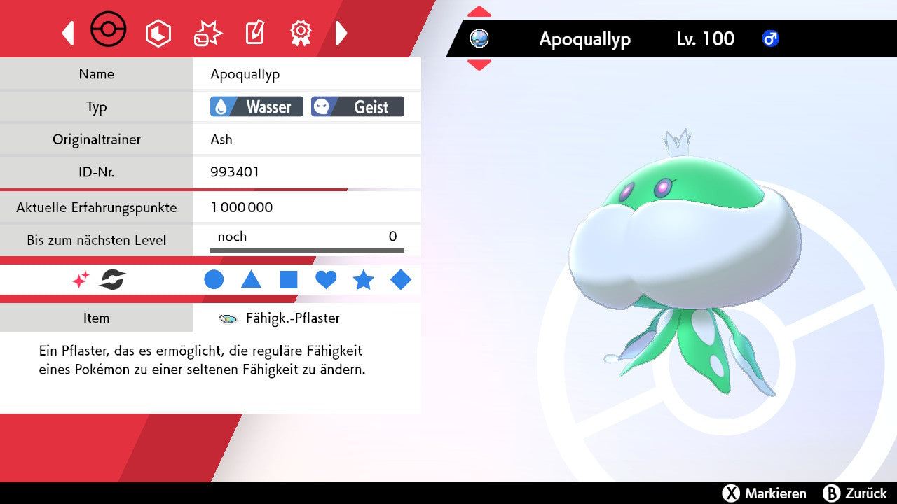 Das Pokemon ist mit beeindruckenden 6×31 IV-Werten ausgestattet. Das bedeutet, dass es auf allen sechs Werten (KP, Ang., Sp-Ang., Vert., Sp-Vert., Init.) die maximalen 31 IV/DV-Punkte besitzt. Dein Pokemon startet somit mit herausragender Stärke in digitale Kämpfe.