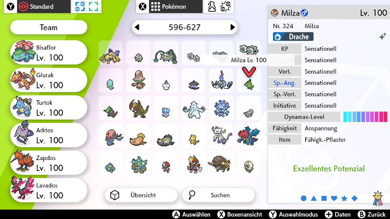 Das Pokemon ist mit beeindruckenden 6×31 IV-Werten ausgestattet. Das bedeutet, dass es auf allen sechs Werten (KP, Ang., Sp-Ang., Vert., Sp-Vert., Init.) die maximalen 31 IV/DV-Punkte besitzt. Dein Pokemon startet somit mit herausragender Stärke in digitale Kämpfe.