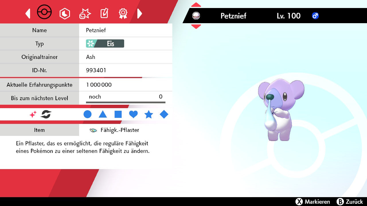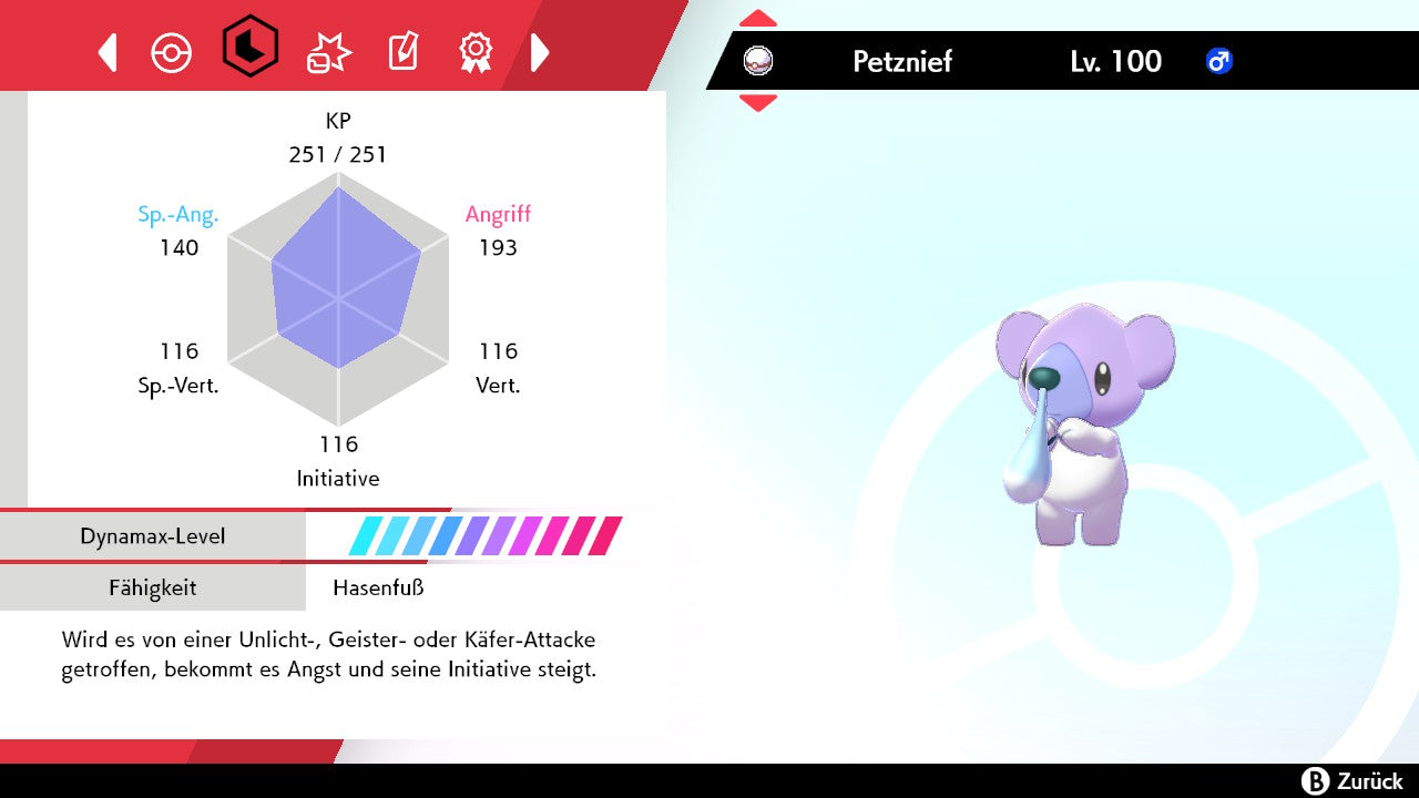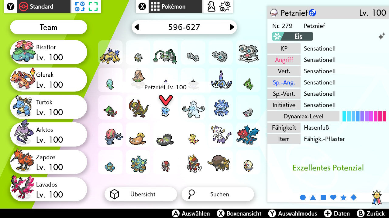 Das Pokemon ist mit beeindruckenden 6×31 IV-Werten ausgestattet. Das bedeutet, dass es auf allen sechs Werten (KP, Ang., Sp-Ang., Vert., Sp-Vert., Init.) die maximalen 31 IV/DV-Punkte besitzt. Dein Pokemon startet somit mit herausragender Stärke in digitale Kämpfe.