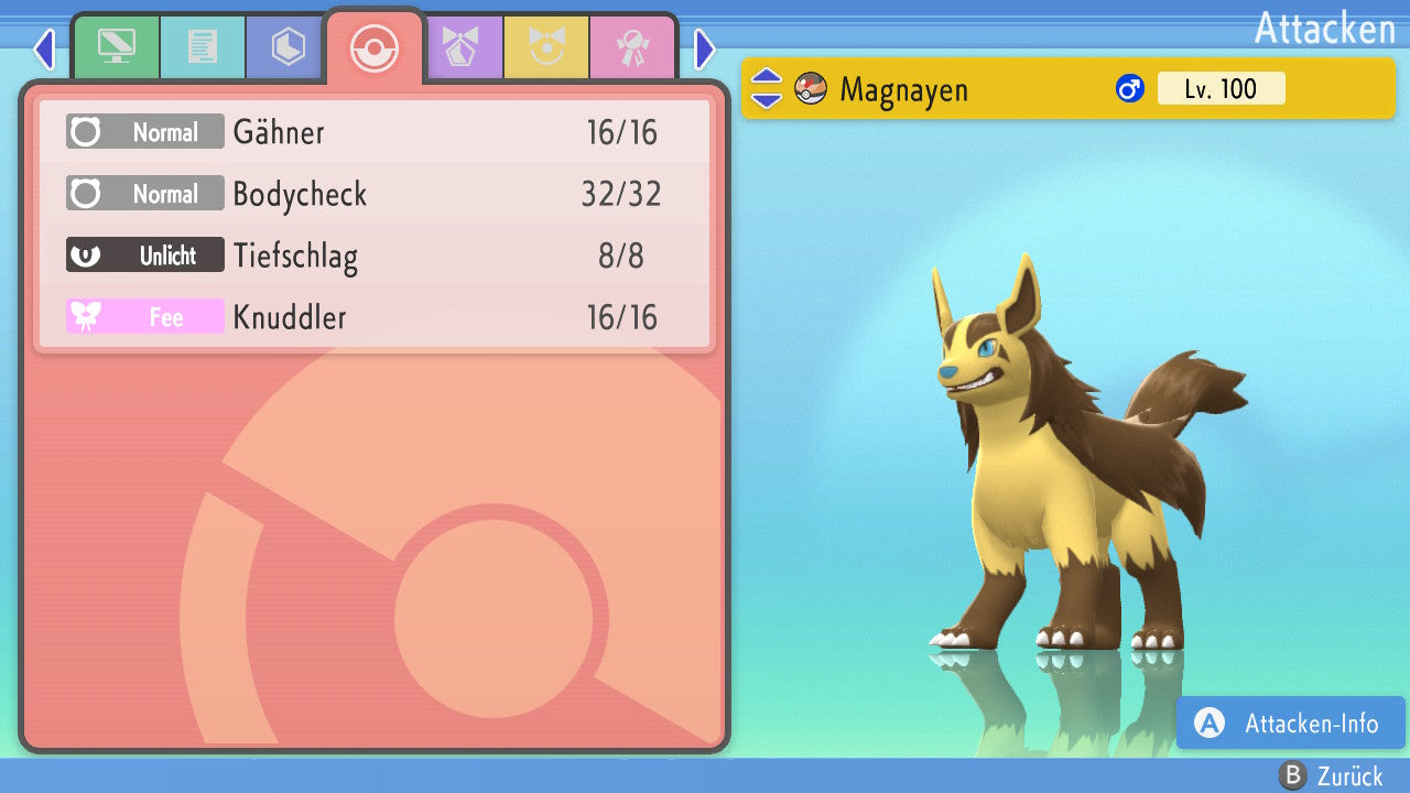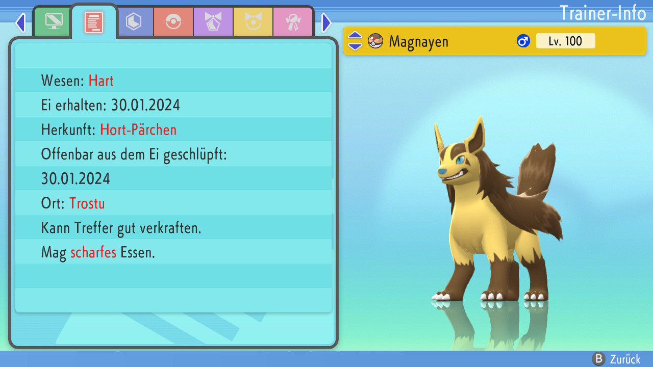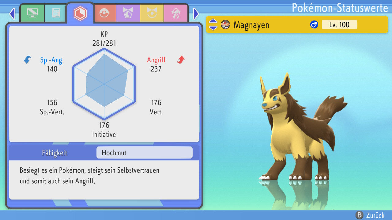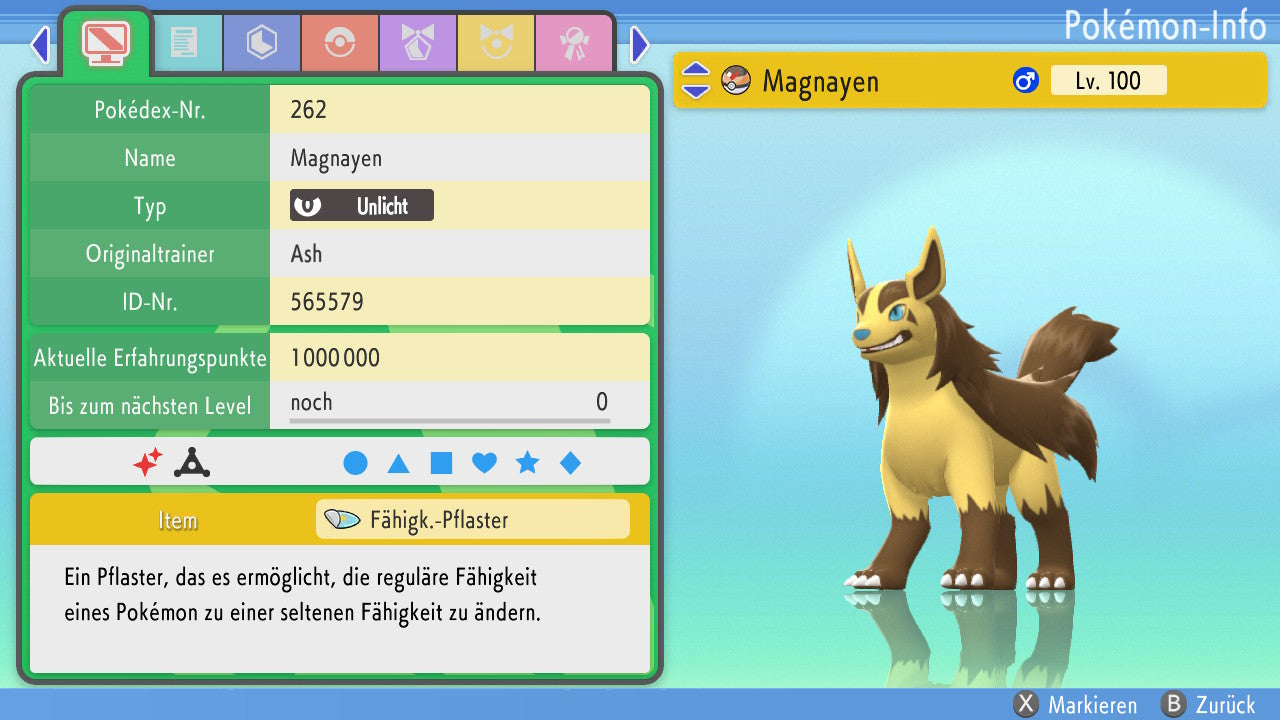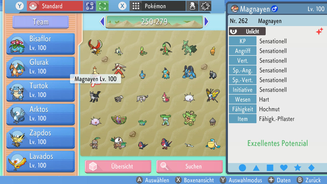 Das Pokemon ist mit beeindruckenden 6×31 IV-Werten ausgestattet. Das bedeutet, dass es auf allen sechs Werten (KP, Ang., Sp-Ang., Vert., Sp-Vert., Init.) die maximalen 31 IV/DV-Punkte besitzt. Dein Pokemon startet somit mit herausragender Stärke in digitale Kämpfe.