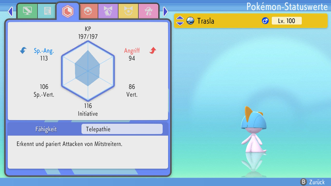Das Pokemon ist mit beeindruckenden 6×31 IV-Werten ausgestattet. Das bedeutet, dass es auf allen sechs Werten (KP, Ang., Sp-Ang., Vert., Sp-Vert., Init.) die maximalen 31 IV/DV-Punkte besitzt. Dein Pokemon startet somit mit herausragender Stärke in digitale Kämpfe.